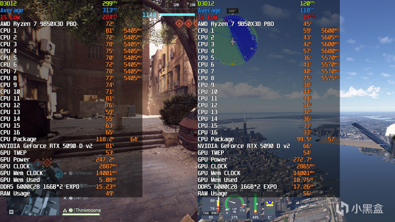 值得一提的是,锐龙7 9850X3D最大睿频为5.6GHz,但并不意味着它在所有游戏场景都能稳定5.6GHz,按照以上测试的十二款游戏,其频率浮动范围一般保持在5.4~5.6GHz之间,是根据游戏负载和类型动态调整的,9800X3D想要达到9850X3D这种频率,一般需要超外频,而且需要良好体质作为前提。