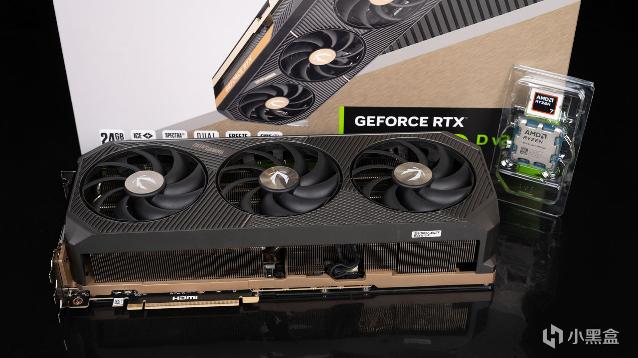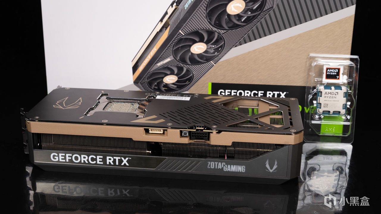 侧面质感也相当不错,中框点缀之余,经典GEFORCE RTX LOGO还采用特别的古铜色亮面作为背景衬托,右侧则是ZOTAC GAMING LOGO,支持ARGB灯效。12V-2x6 16pin供电接口是偏右设计便于接线,供电接口旁边则是双BIOS按钮和ARGB同步接口。