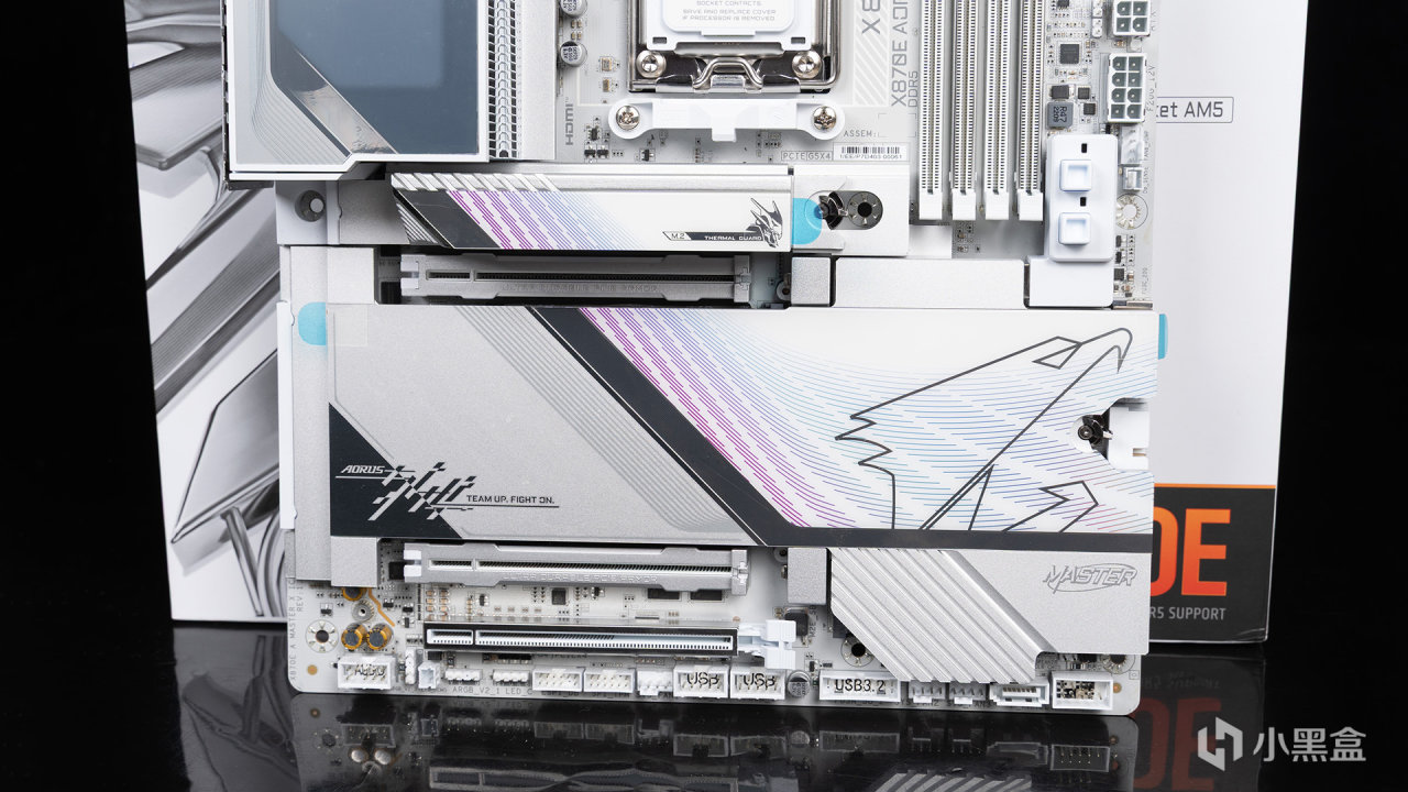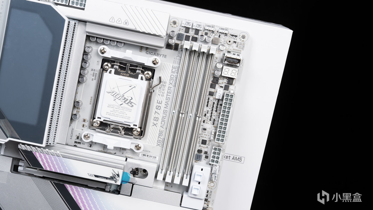本次测试主板——技嘉X870E AORUS MASTER X3D ICE超级冰雕,外观围绕纯白主题打造,附带大雕、MASTER等相关LOGO,结合了金属亮面区域点缀,整体质感拉满,采用低阻抗、2盎司铜、背钻工艺的8层白色PCB奢华打造。