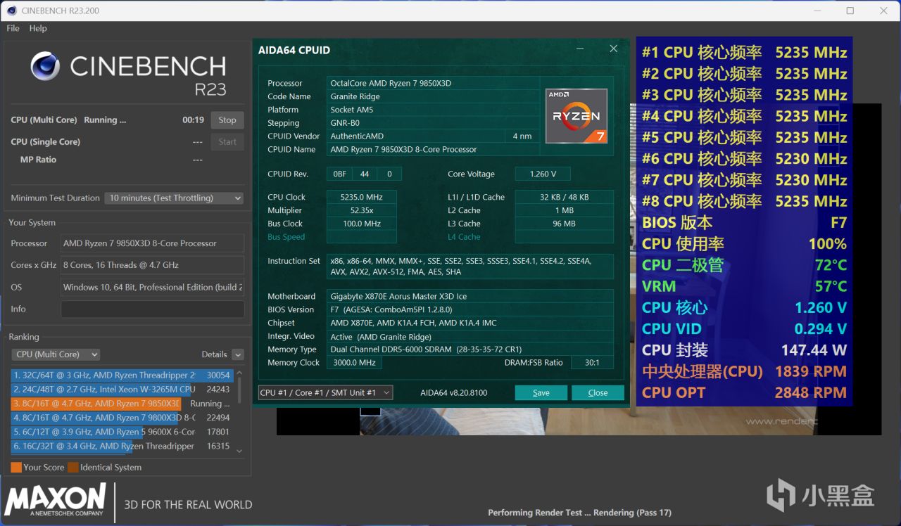 锐龙7 9850X3D开启PBO ENABLE运行CINBENCH R23多核项目十分钟,CPU二极管温度为72℃,软显功耗为147W。