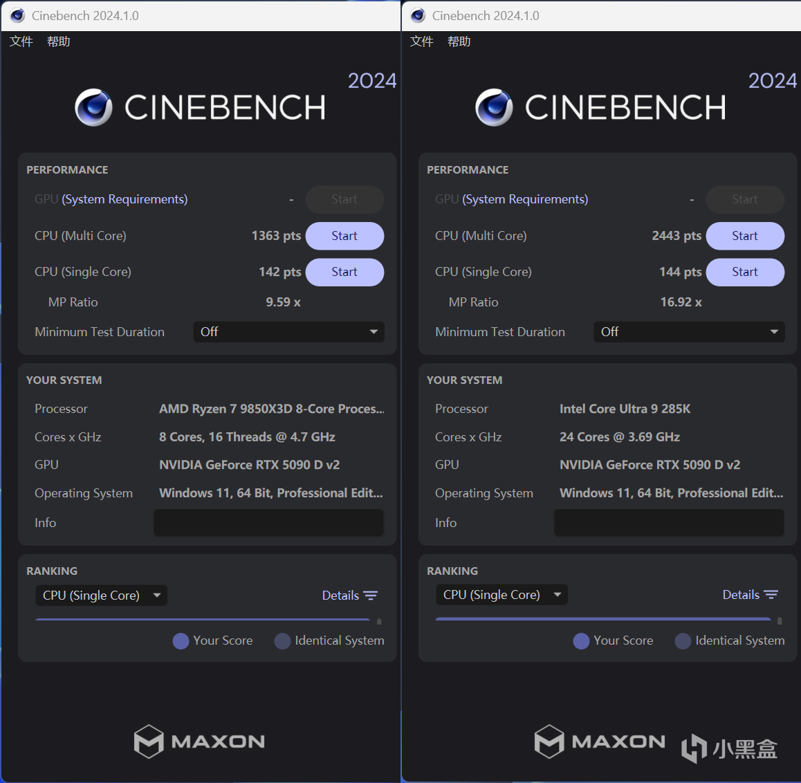 CINEBENCH 2024版本,升级了Redshift引擎更能反映实际工作流性能,计算量提升负载压力更大尤其是单核测试。结果来看,锐龙7 9850X3D单核表现基本和Core Ultra 9 285K是同一个水平线上了。