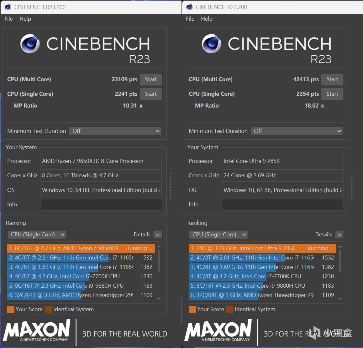 理论项目就直接用CINEBENCH R23来验证,核心引擎是Cinema 4D,作为参考对比是最为广泛,因为最高睿频提高了,锐龙7 9850X3D的单核性能自然也是对应提升,领先9800X3D大致有8%幅度,多核性能则是完全一致,这就是意料之内的事情了。