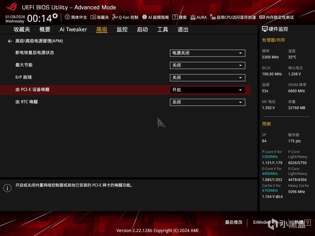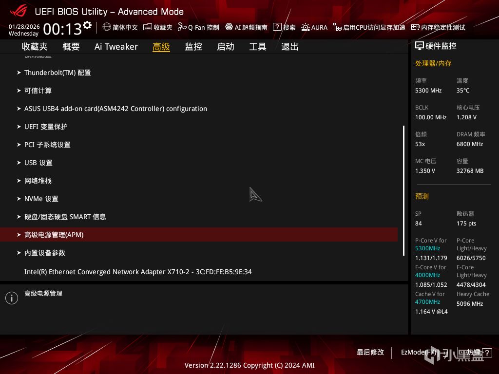 這裏以華碩Z790吹雪主板爲例,首先開機進入BIOS,進入 高級——高級電源管理(APM)選項卡:
