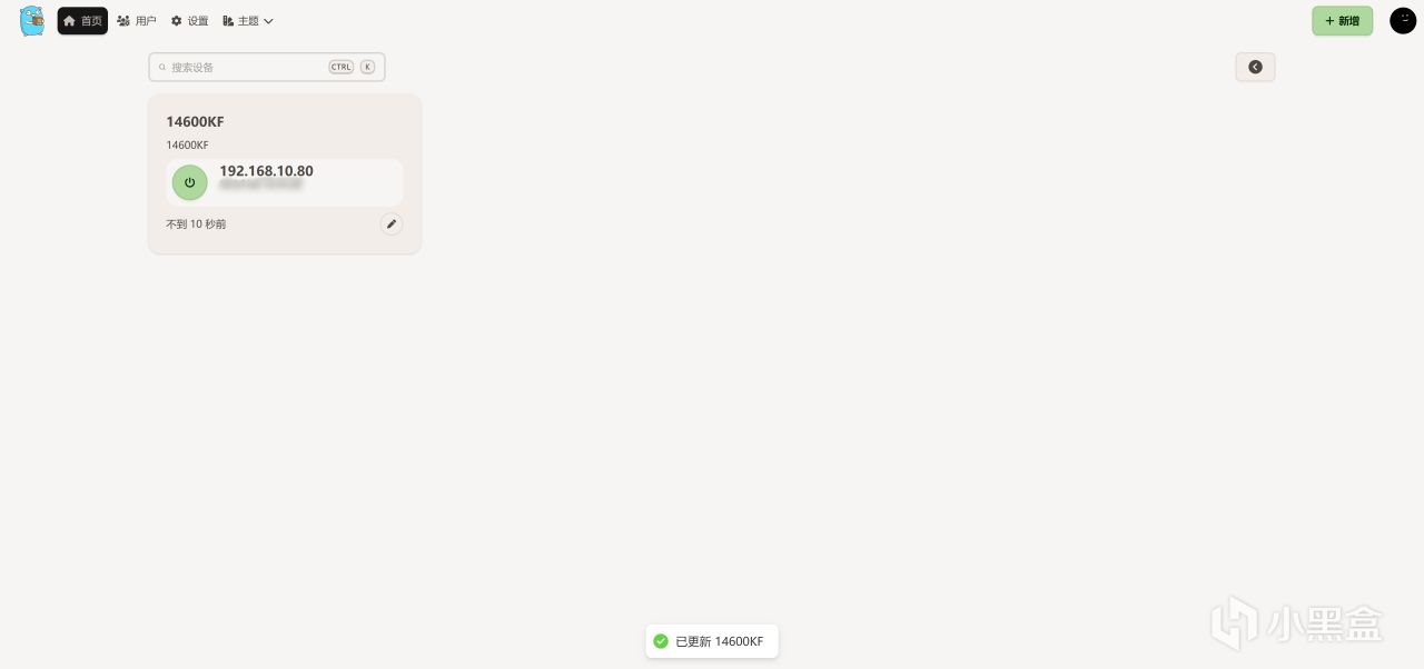 保存好配置信息後,我們再次回到首頁,就能看到剛纔添加的設備了。此時設備爲綠色電源,說明是已在通電開機狀態。