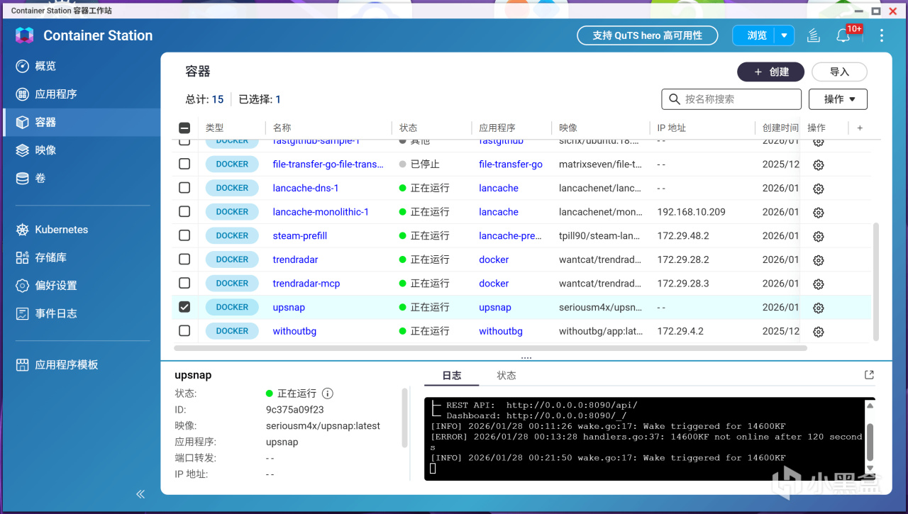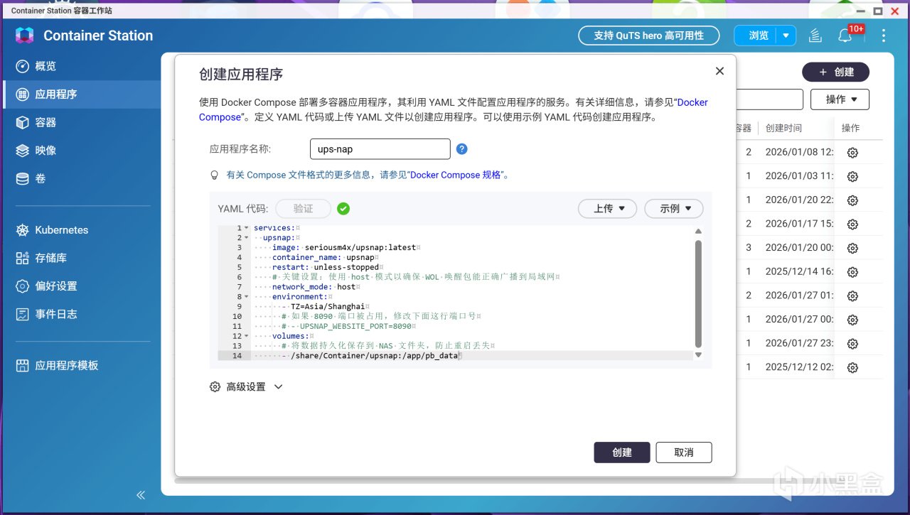 代碼粘貼無誤後,記得點擊下方的 “驗證”按鈕,確保YAML格式正確,最後點擊創建按鈕,系統就會自動拉取這個非常精簡的鏡像並啓動服務,咱們可以在容器列表中看到upsnap這個容器正在運行,狀態顯示爲綠色小圓點。