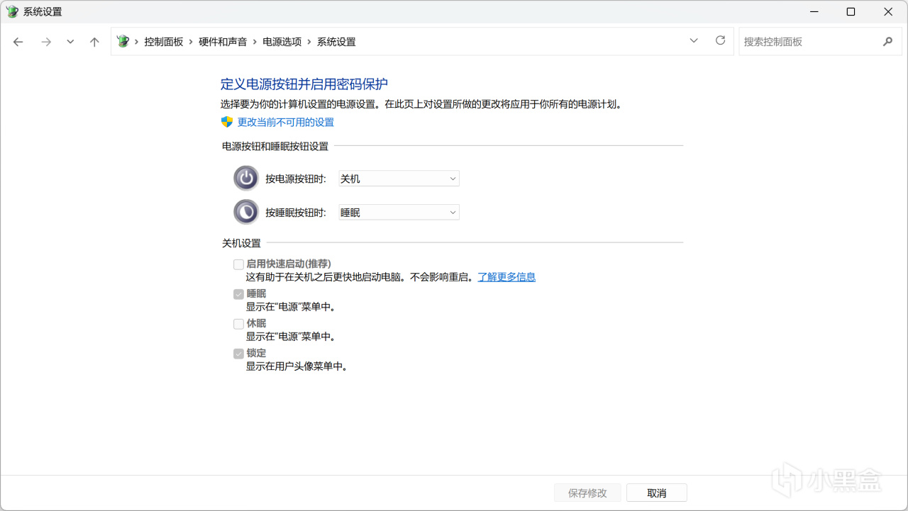 所以我們打開“控制面板”——“硬件和聲音” ——“電源選項” -——“選擇電源按鈕的功能”,取消勾選“啓用快速啓動” 。