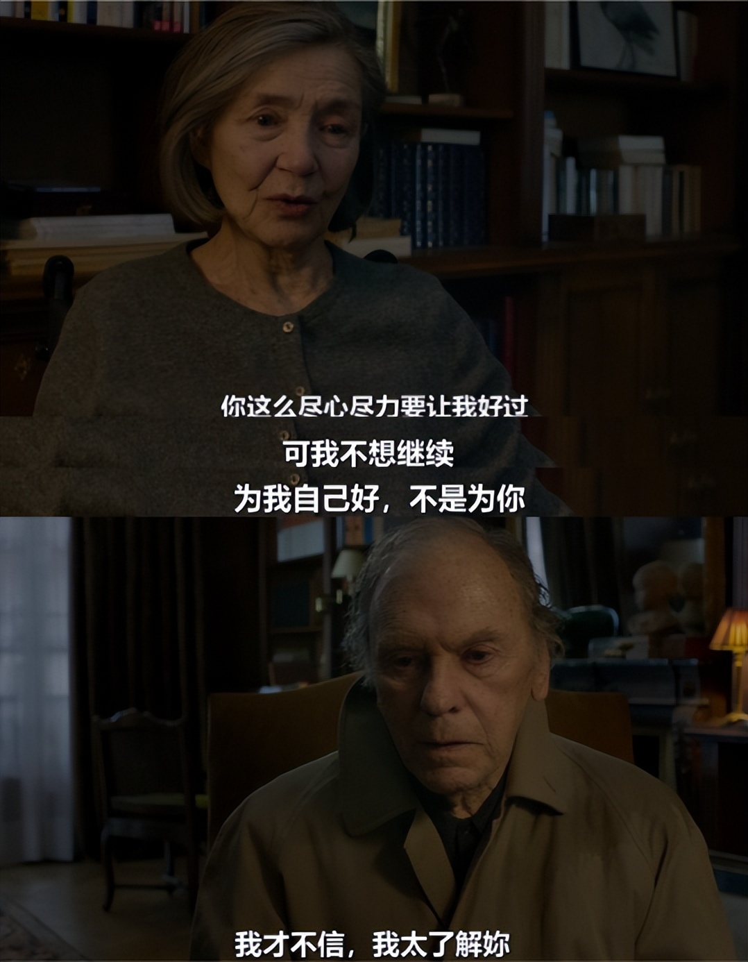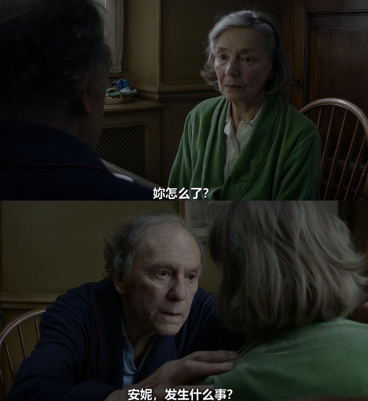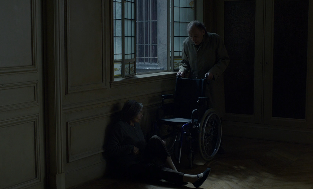 手术失败,安妮半身不遂。但走过大半辈子的两个人,可以装作什么都没有发生。高兴时,他们甚至会在客厅玩轮椅,在饭桌上说笑,分享往日的糗事,聊起有哪个朋友去世。