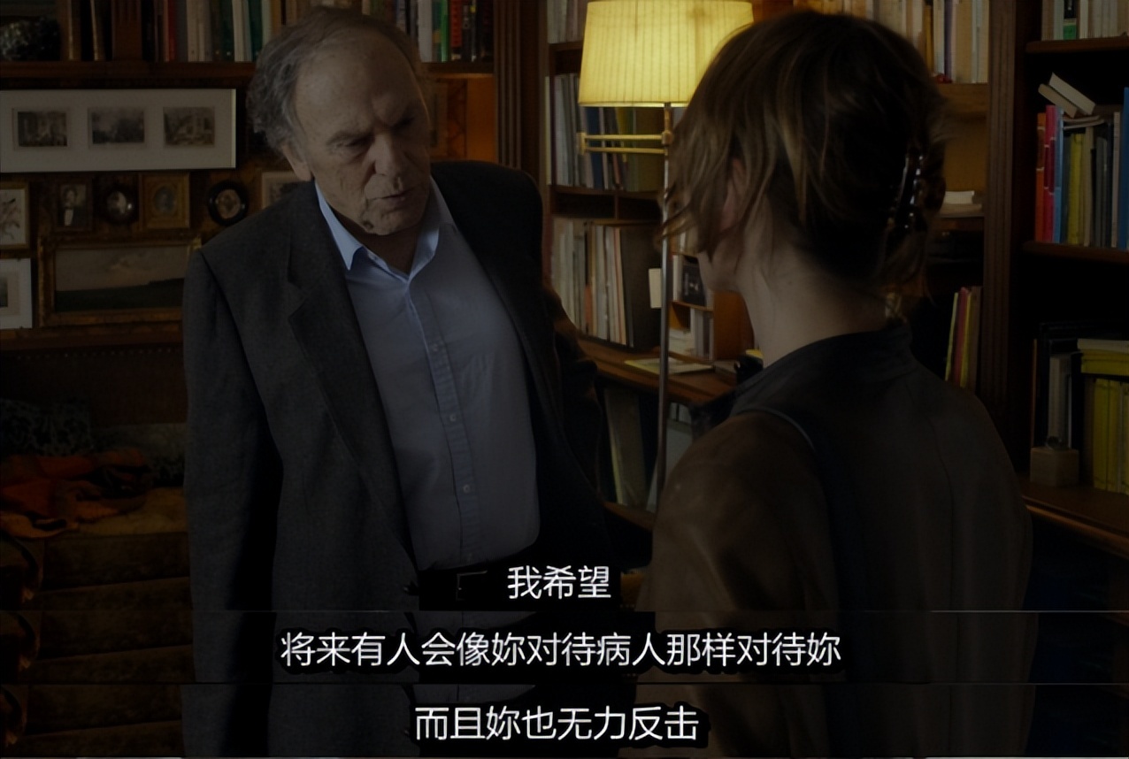 现实一步步地把乔治压垮。他新请的一位护工,态度粗暴,不顾感受地为安妮梳头,更拿镜子往安妮的脸上怼。愤怒的乔治没摆好脸色地将护工辞退,却与后者发生了争执,他想起邻居前日对他表达的微妙“敬佩”——就好像,他已成为别人眼中的精神病。