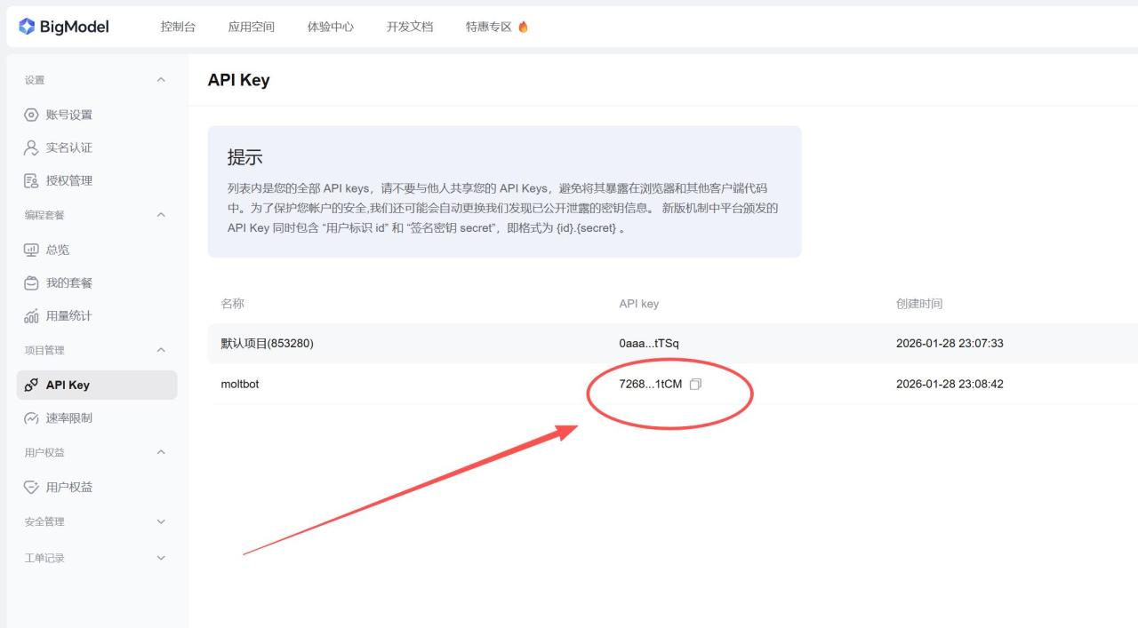 去智譜官網控制檯創建一個API key;Moltbot 用 zai provider + 這個 key 來鑑權。