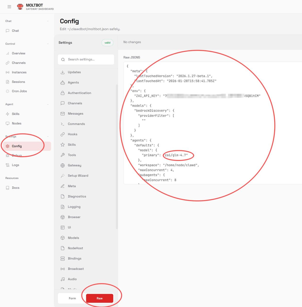 在 Control UI 的 Raw JSON 裏粘貼/修改 → 點 Save(保存到文件)