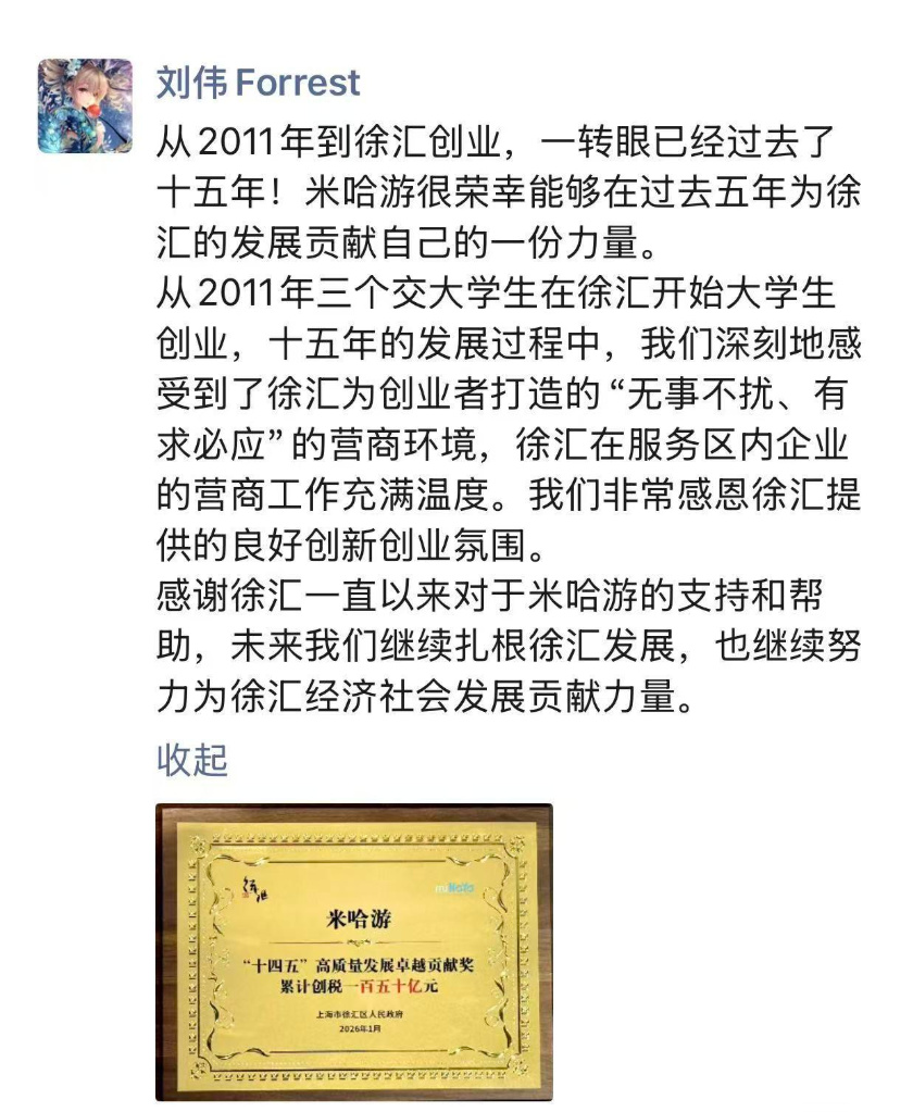 表彰大會結束後,米哈遊聯合創始人劉偉(業界常稱“大偉哥”)在朋友圈發文,表達對徐彙區支持的感謝,並表示未來米哈遊將繼續紮根徐匯,努力爲區域經濟社會發展貢獻更多力量。