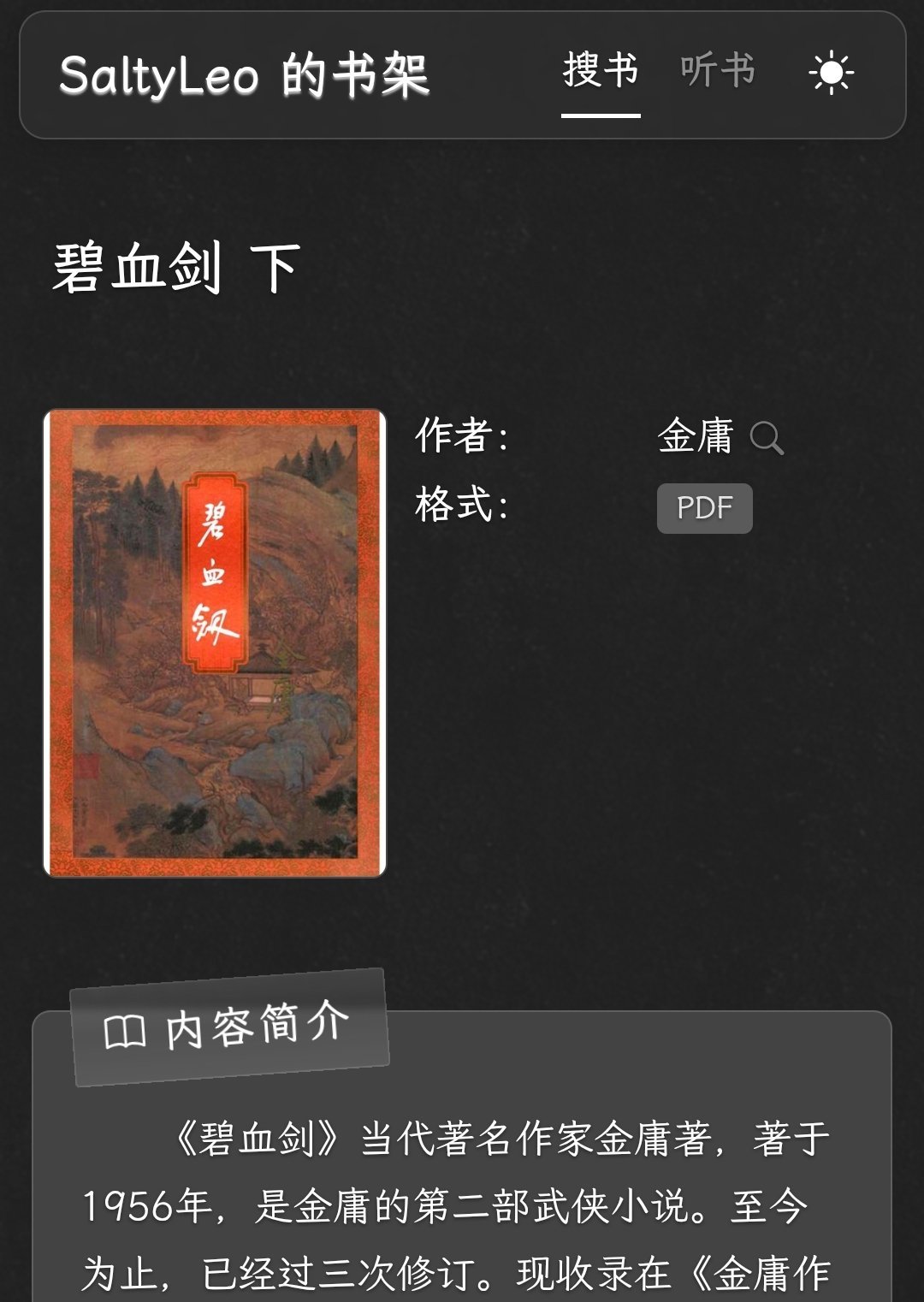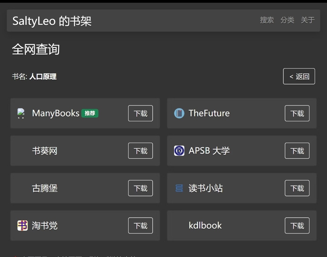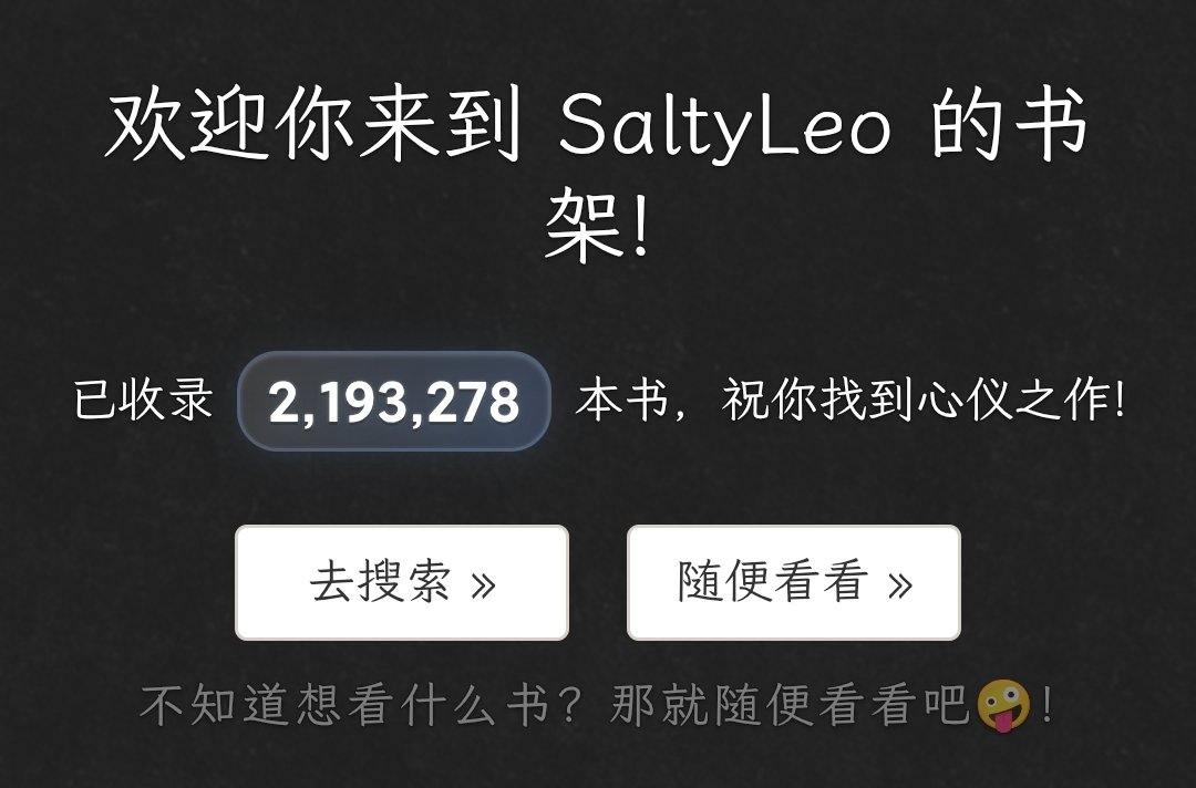 SaltyLeo的书架是超实用的聚合类电子书搜索引擎,专门整合了全网多个优质电子书下载站的资源,海量藏书数万本,各类题材和品类都能找到。
