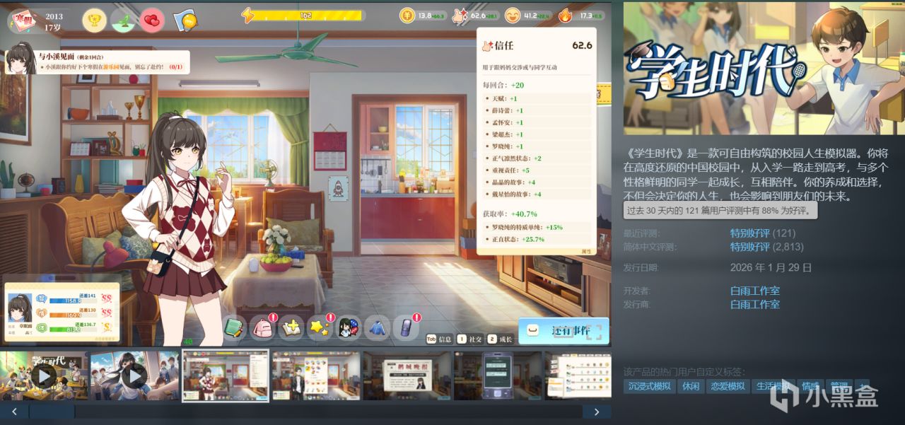《学生时代》是一款可自由构筑的校园人生模拟器。你将在高度还原的中国校园中,从入学一路走到高考,与多个性格鲜明的同学一起成长,互相陪伴。你的养成和选择,不但会决定你的人生,也会影响到朋友们的未来。