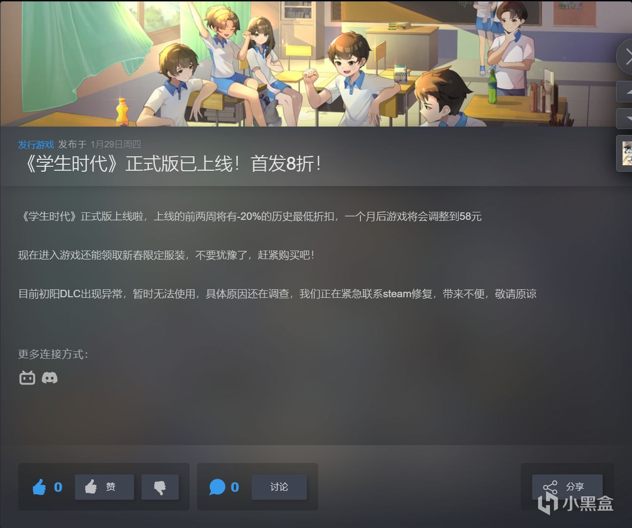 《学生时代》正式版上线啦,上线的前两周将有-20%的历史最低折扣,一个月后游戏将会调整到58元