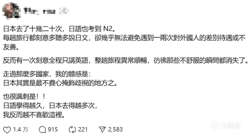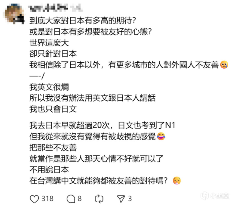 「完全理解,東京在住,坦白說我沒有感受到太多歧視,但說英語的確會得到不一樣的對待」 「日文N1,但在日本遇到事情時,我都先用英文溝通」。