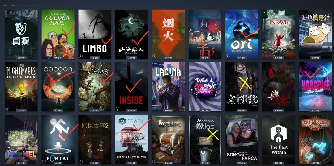 以上游戏不拘泥于游戏形式(类银,动作,平台跳跃,指向点击),但基本没有视觉小说或**g,因为ADHD玩不下去。图上✅表示好玩,❌表示不推荐,什么都没有表示没有特别惊艳我的地方,或者功过相抵了。