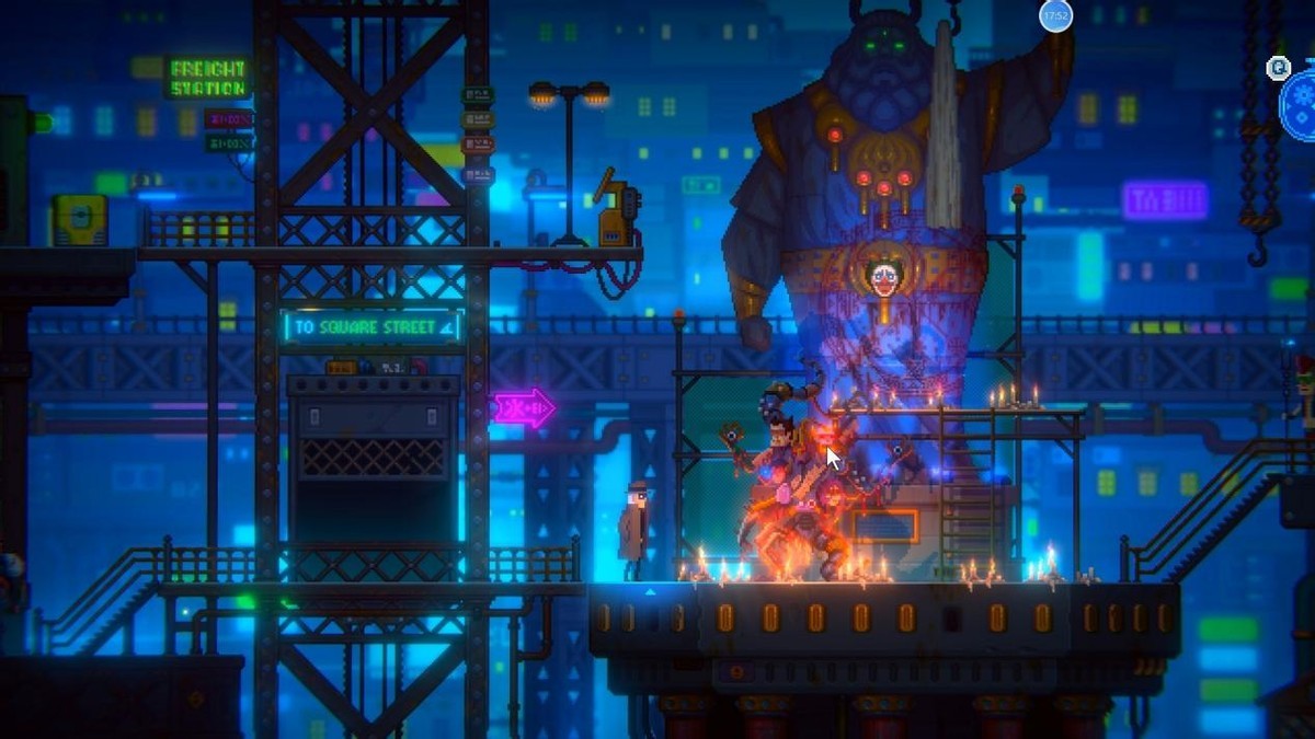 雖然本作和《科技巴比倫》兩者主題相似而且都是像素畫面,但是風格卻差異明顯。如果說《科技巴比倫》的基調比較陰沉,那麼《迷霧偵探》則是努力在賽博朋克的世界裏塑造更多鮮活的色彩,高科技設施與破敗平民建築的對比,在彩虹燈的光影效果之下,呈現出一股別樣的風情。而且在場景設計上,《迷霧偵探》顯然花了更多心思,無論是下水道、街區、酒吧還是橋上的藝伎投影,都各有特色。賽博朋克是充滿了讓人不安的壓抑想象,但卻也不失迷人的藝術感,在像素風格之下做出了這種美術效果,這也算是本作最成功的地方。