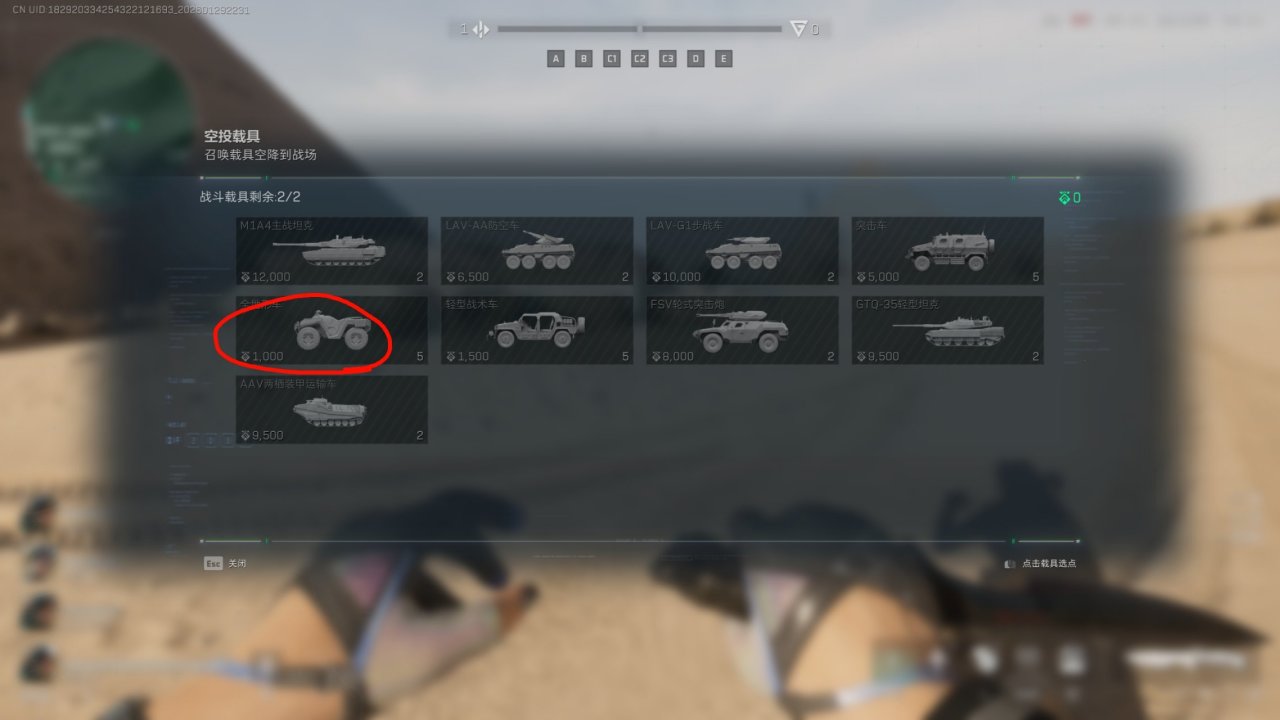 你也可以在阵地支援的选“空投载具”,然后投放这个1400分的小车,但是每个载具投放之后有冷却时间,所以建议放一次小车和两次烟雾。