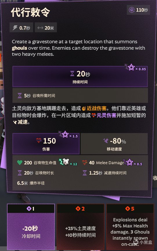 升级效果3:爆炸会造成5%目标生命值伤害。在创造墓碑时立即召唤三个食尸鬼。