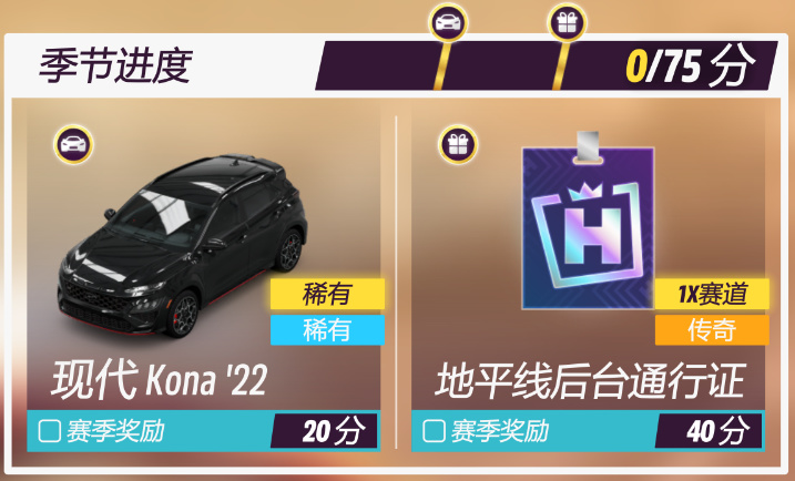夏季赛20分进度奖励为2022款现代 KONA N和40分进度奖励为地平线后台通行证