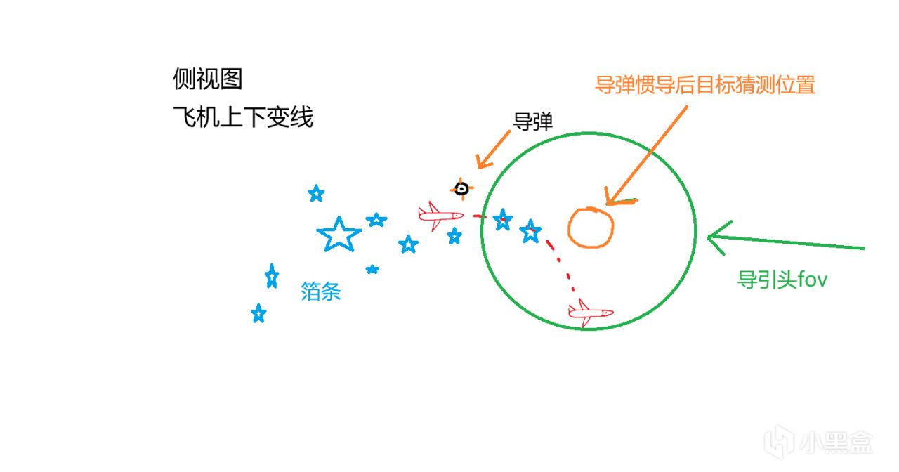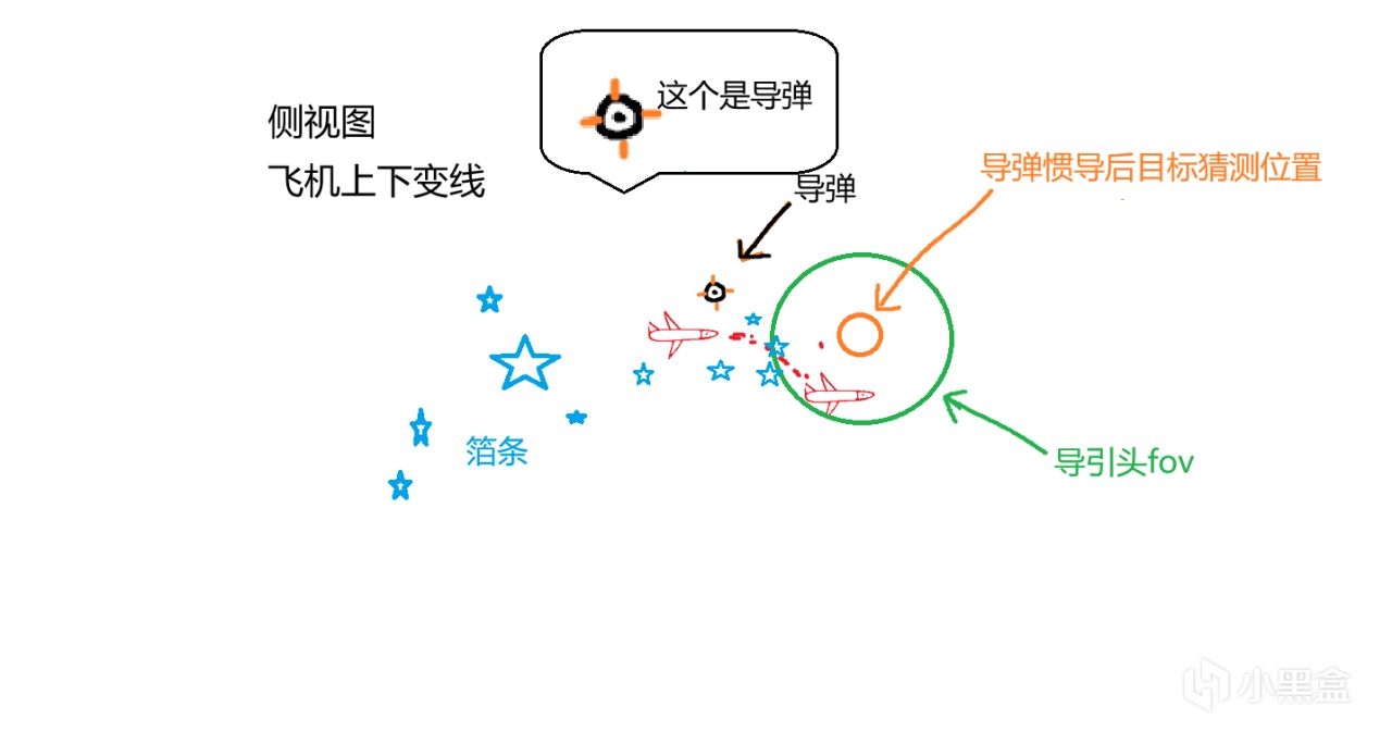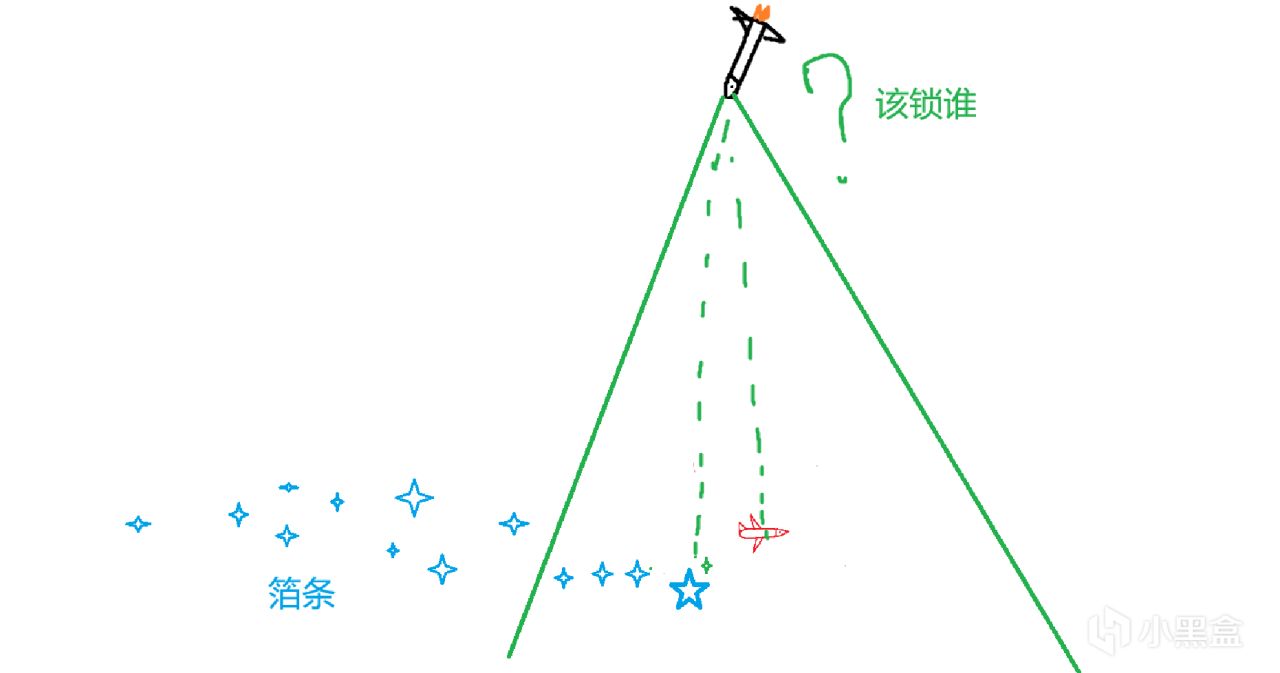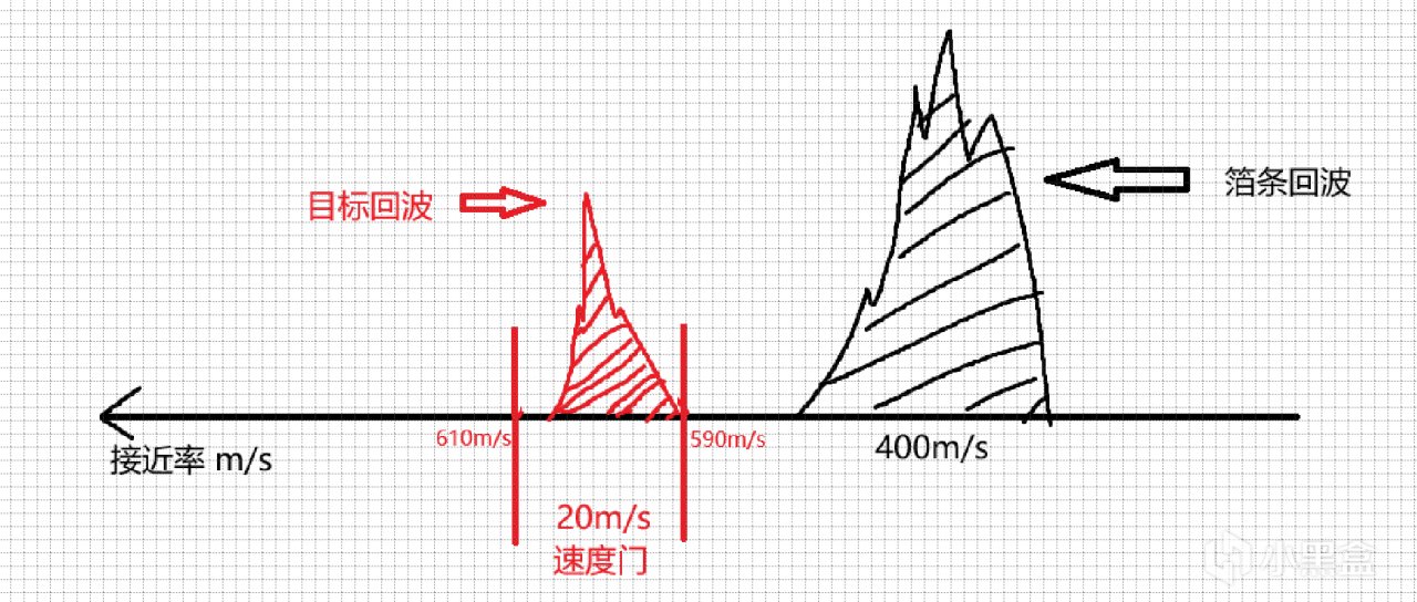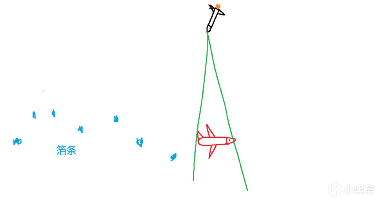 请注意,这里的图主要起示意作用,实战中,由于导引头fov较大,几乎不可能看不到箔条,但对于 导引头fov的主动弹,或者是雷达主瓣宽度较小的半主动弹,由于其波束集中,若箔条处于主瓣照射的边缘,箔条的信号强度很可能小于飞机,此时,即使箔条信号在速度门之内,导弹也会继续锁定飞机(飞机信号强度更高)