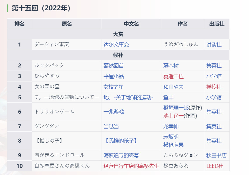 这部作品于2022年挑落《蓦然回首》《地。-关于地球的运动-》,斩获第十五回日本“漫画大赏”,险些在2024年“讲谈社漫画赏”上战胜《金牌得主》,并于今年一月获得了BELLNOX FILMS出品,作画质量颇高的动画改编。