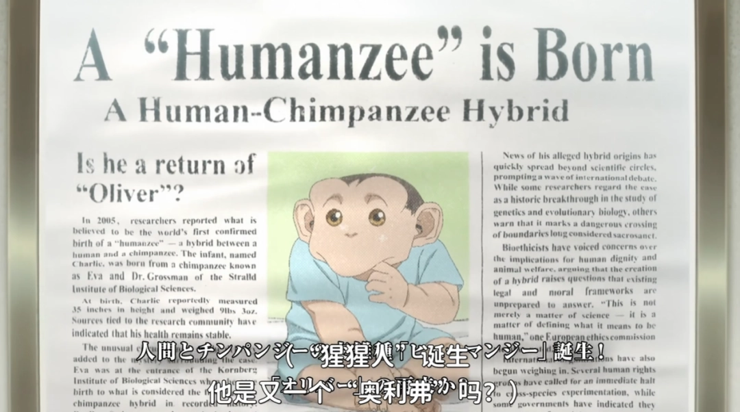 博士完事儿几个月后,他的研究所就被极端动保恐怖分子袭击了(我看活该)。他本人不知所踪,研究所里只剩下了难产的雌黑猩猩和肚子里的查理,而这动保组织也是忠厚人,还真找了家动物医院给黑猩猩接了生。后面还有动保主义的议员给这货找了养父养母,让他们从小按人类的方法养查理,还送五岁的查理上学,看看能不能让这只半黑猩猩“社会化”。
