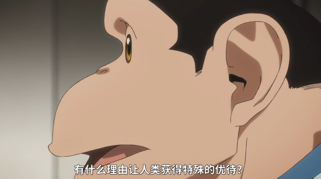 事实上,抛开猎奇的“人×兽”噱头和多少带点政确的素食主义宣传,《达尔文事变》的题材,确实很适合营造此类不同价值观的碰撞——非人处在人类社会中天然的异质感、拥有了人类思考能力的其他智慧生物动物能否被称作人、人类的伦理价值观又是否能在其身上适用……随便想想,就能扒出一大堆值得深挖的矛盾点。隔壁的《猩球崛起》《寄生兽》等作品就是这么做的——可以说,“人与非人”天生就是个容易拔高深度的题材。