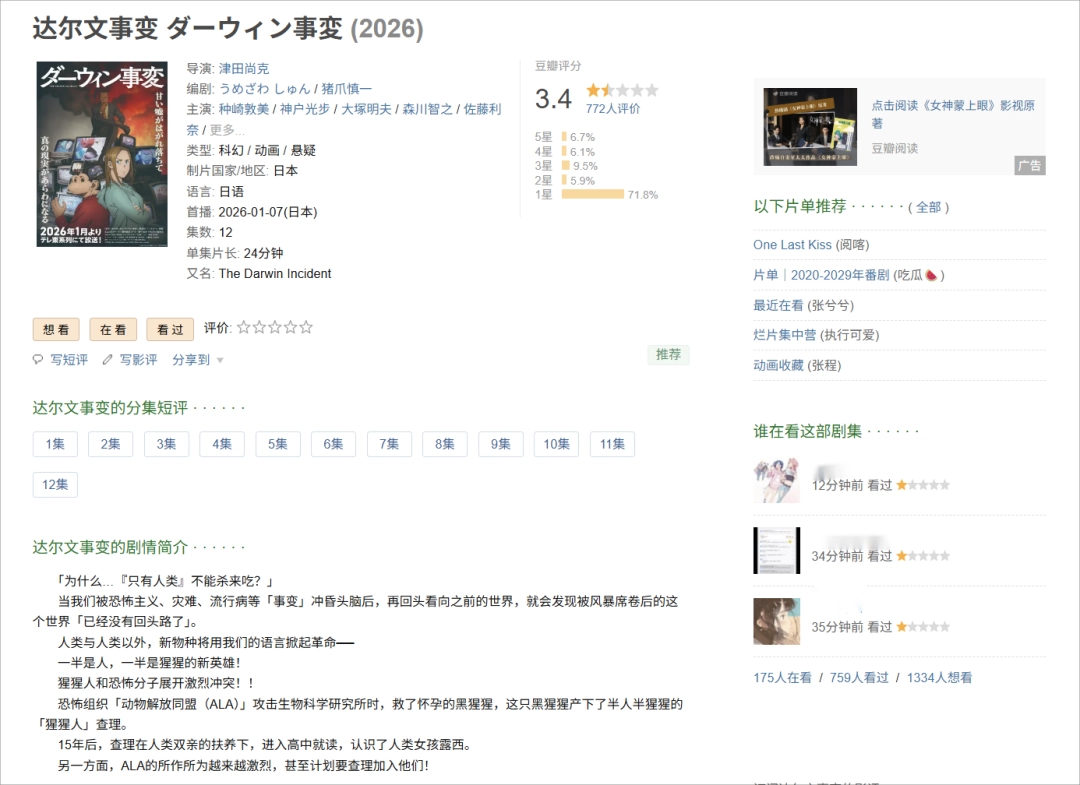 大奖加身带来的关注度,与其在动画化后产生的破圈舆论一同,让这只杂交猩猩彻底变成了“带明猩”——兴许是从小被教育“与天奋斗,其乐无穷;与地奋斗,其乐无穷;与人奋斗,其乐无穷”的价值观,与作品中的不可名状之物产生了激烈冲突,或许是被常年以来**们的各种神论搞得不厌其烦,在日本颇受好评的《达尔文事变》在中文互联网上遭遇了口碑闪崩,豆瓣评分高达3.4。