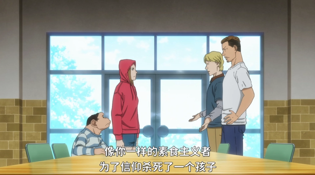 嘿!你说巧不巧,这查理因为“养父母的习惯”,刚好就是个素食主义者,方才那个极端组织的Logo还刚好是只猩猩,此时又刚刚好有个家里开餐馆(被素食主义运动影响)的壮壮,发现了这只素食猩猩而前来找茬——上来就是“像你这样的素食主义者杀了孩子”的偷换概念和“再这么下去所有人都不能吃肉啦”的超绝滑坡……