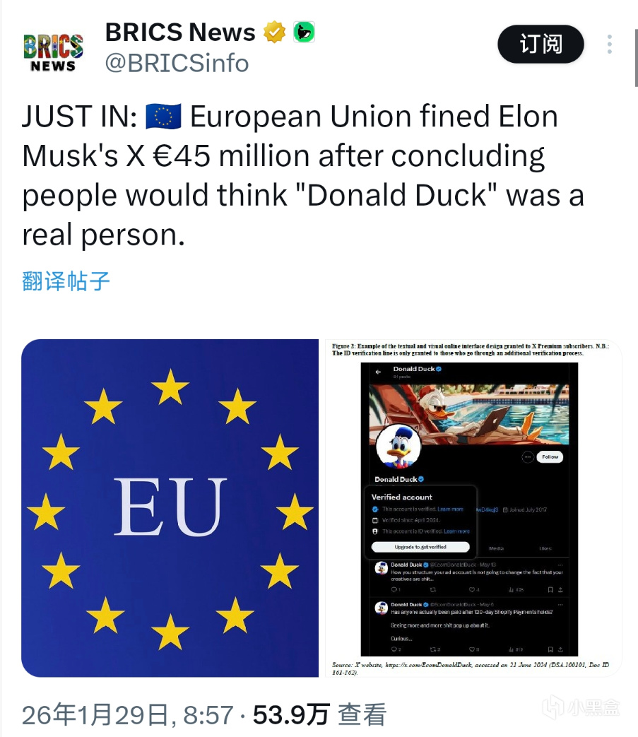 近日:歐盟對埃隆·馬斯克的X處以4500萬歐元的罰款,原因是歐盟認爲人們會認爲“唐老鴨”是一個真實存在的人。