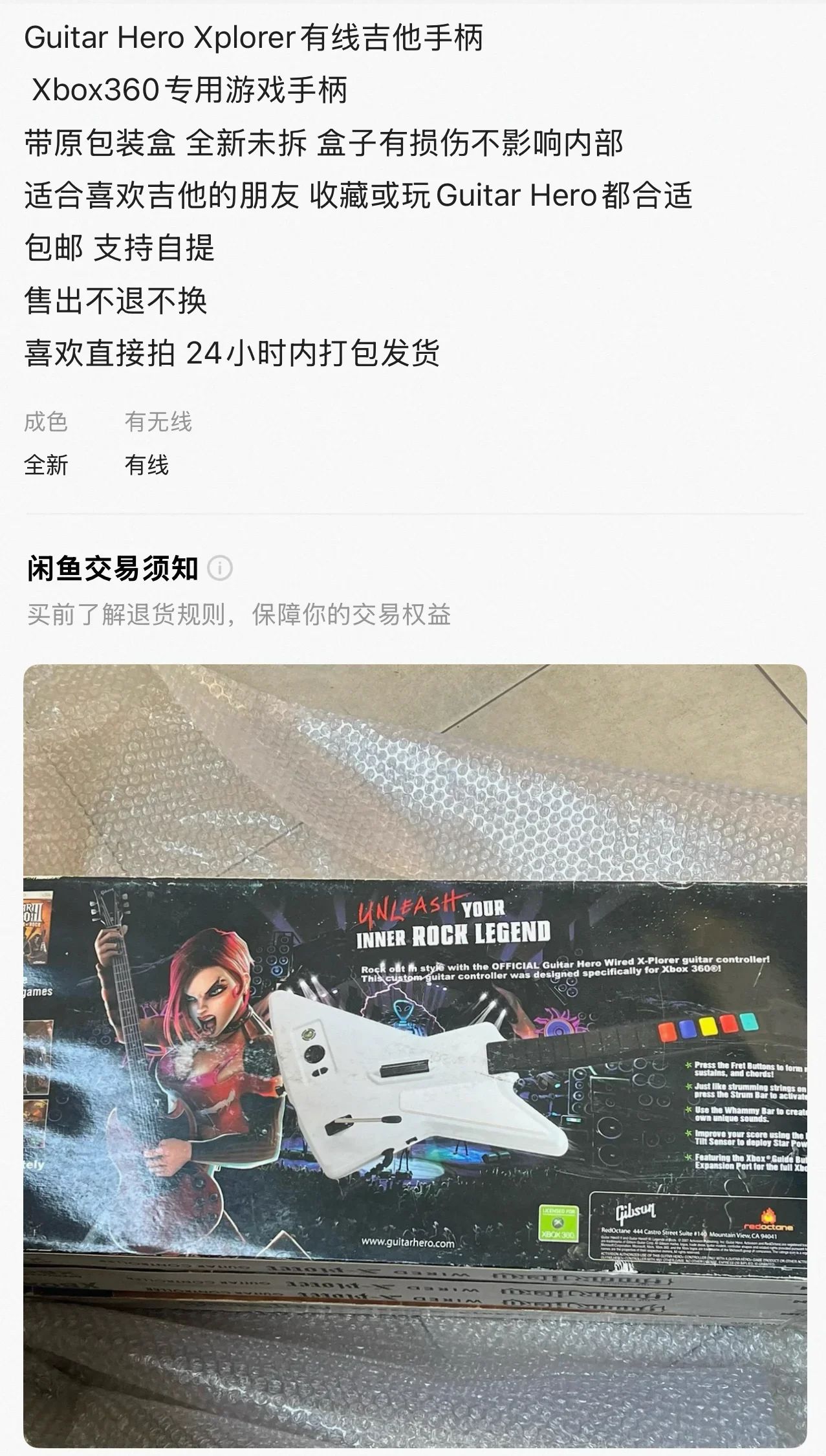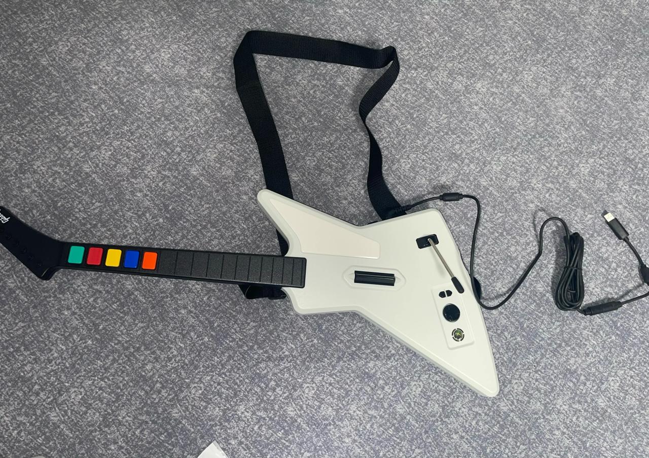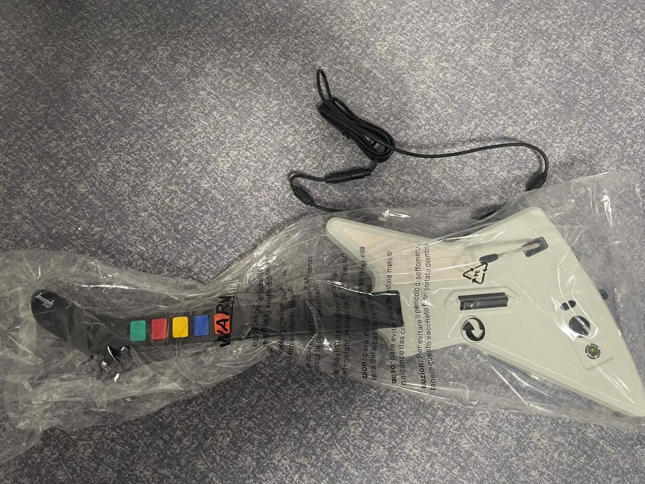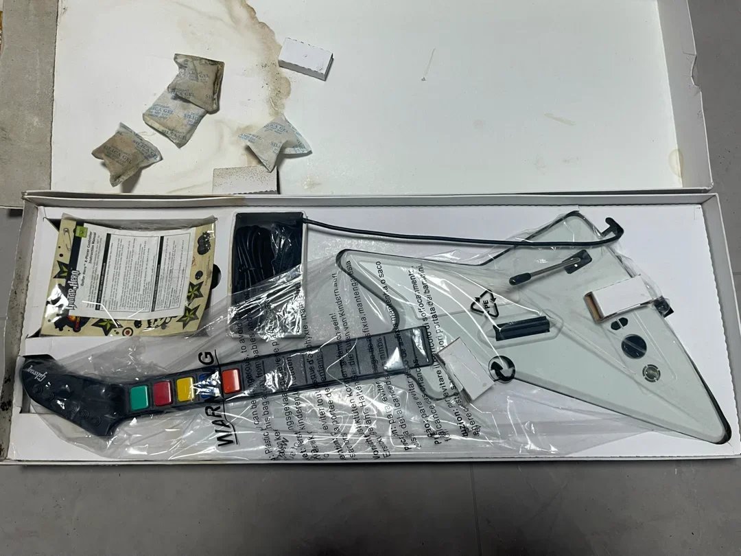 后来查询发现这是一款2017年发售的吉他手柄,专门为吉他英雄这个游戏做的。没想到都已经10年了居然还有全新的东西。