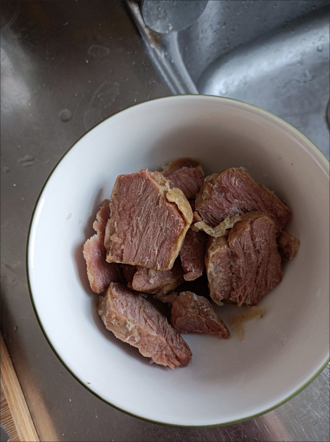 優點是便宜,真牛肉。味道算是中等偏上,但略微有一丟丟酸味,可能是沒有排酸的原因吧。基本嘗不出來。一包大概是2兩(一小碗),作爲一餐的肉量完全達標。整體是小日子過得不錯的朋友的優質選擇,推薦空虛後補充一袋