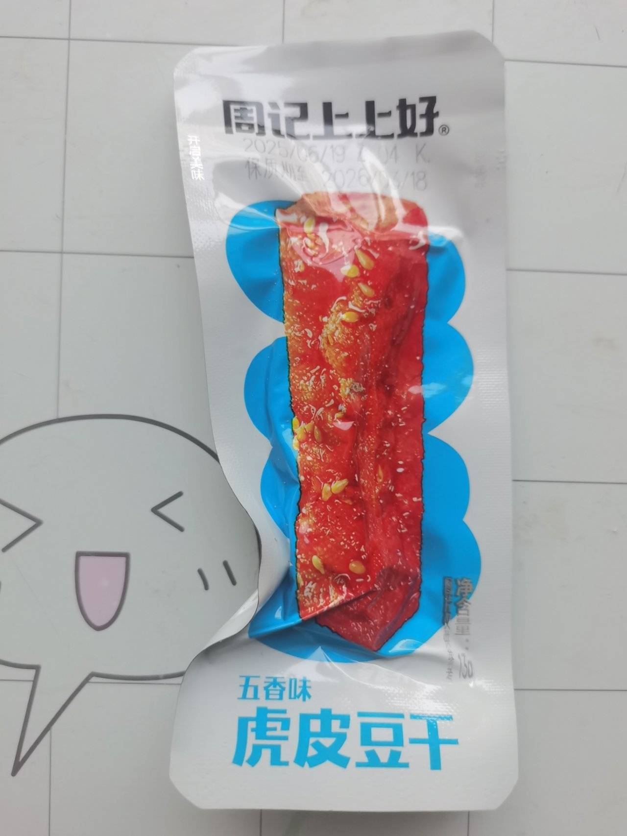 叫做豆乾,其實是素肉,就是那種扁扁的手撕素肉。沒什麼特點,就是單純鹹辣味,缺點是個頭太小了,還不如手指頭粗,小小一個還沒怎麼嚼就沒了,韌性也一般,偏軟,整體口感一般。不會再買了。辣度3.5星🧡🧡🧡🤍🤍