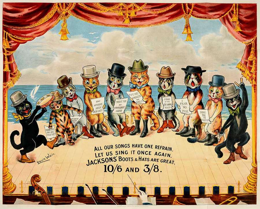 这种风格便成为了我们的灵感来源之一,当然——《Punch》只是其中一类动物画的代表,我们还参照了诸多时代相近的画家,例如我们都很喜欢(甚至经常截下来作表情包)的“猫奴画家”路易斯·韦恩(Louis Wain),猫不仅仅是他绘画的主题,也是他的心灵寄托。他的猫咪装饰画被印刷在了明信片和儿童杂志上,传入了千家万户。