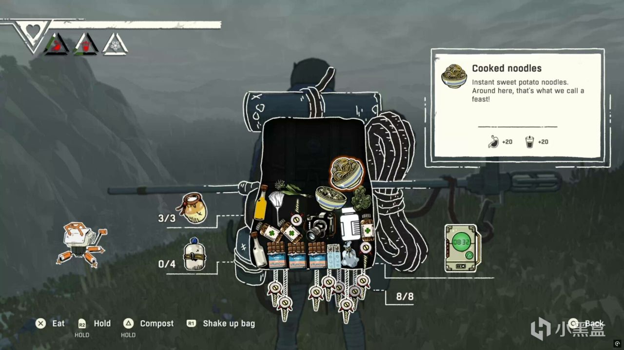 在旅途中,我们可以收集各种各样的资源,比如水、茶包、方便面、草药、蘑菇等等(背包空间有限),以及能最大程度利用这些资源的食谱。食材越好、种类越丰富,对提升各类指标的持久效果就越好。我最喜欢的状态效果是“坚韧”,它能冻结我的各项指标,在漫长而艰辛的攀爬中尤其有用。