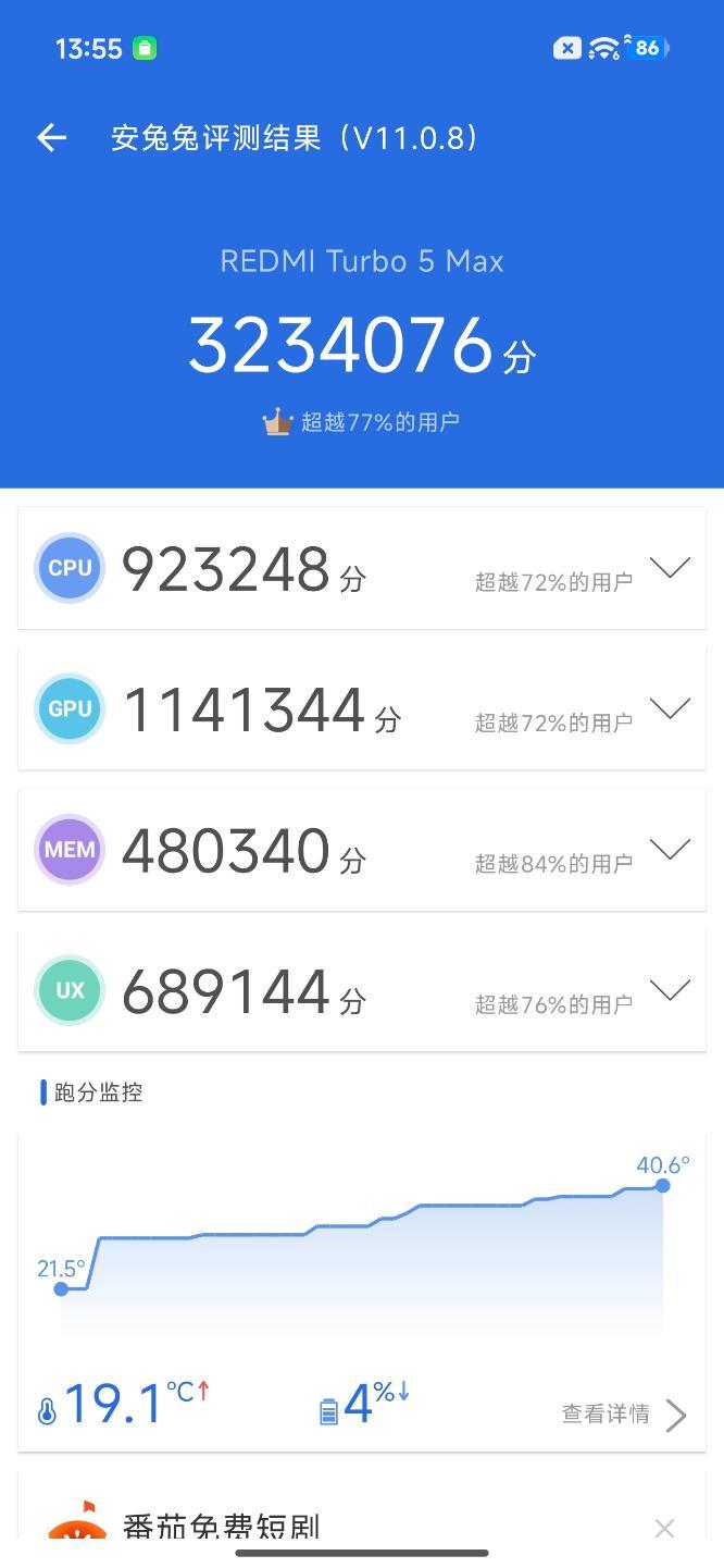 室温场景下,红米REDMI Turbo 5 Max在安兔兔V11跑分为3234076,其中CPU分数为923248分,GPU分数为1141344分,MEM分数为480340分,UX分数为689144分。