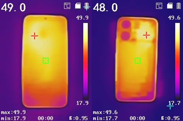 这一点从功耗上也能看出来,红米REDMI Turbo 5 Max在半个小时崩坏·星穹铁道的游戏过程中平均功耗达到了惊人的8W。当然,激进的性能释放也就意味着激进的温度,红米REDMI Turbo 5 Max的正面最高温度达到了49.9℃,背面最高温度达到了49.6℃,手持时,已经有非常明显的痛感了。