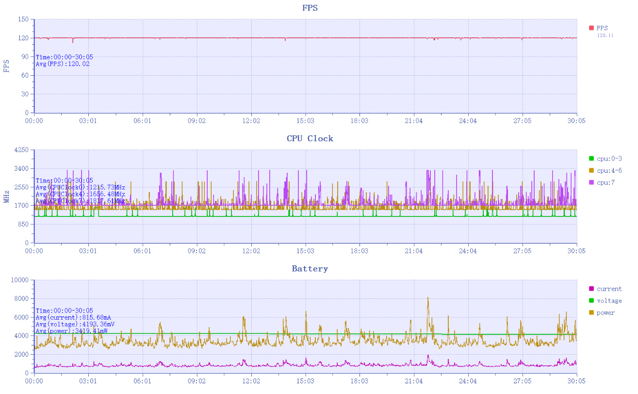 首先是王者荣耀,红米REDMI Turbo 5 Max在极高+原生120帧的情况下进行约半个小时的游戏,整体帧率数据平稳,完全是一条直线的状态,平均帧率120.02帧,1%Low帧117.15帧,最低帧也达到了112.1帧,并且没有任何帧生成延迟,整体体验丝滑。