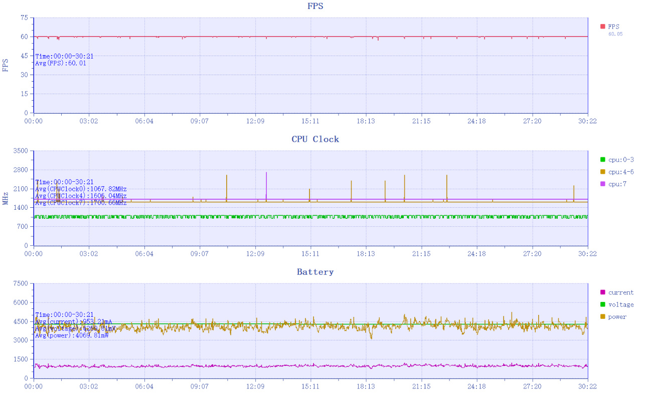 其次是原神,红米REDMI Turbo 5 Max在非常高画质+原生60帧的须弥城半个小时跑图中,数据表现依旧优秀,平均帧率60.01帧,1%Low帧57.93帧,最低帧57,几乎也是一条直线维持到最后,甚至从CPU频率来看,红米REDMI Turbo 5 Max的表现完全游刃有余。