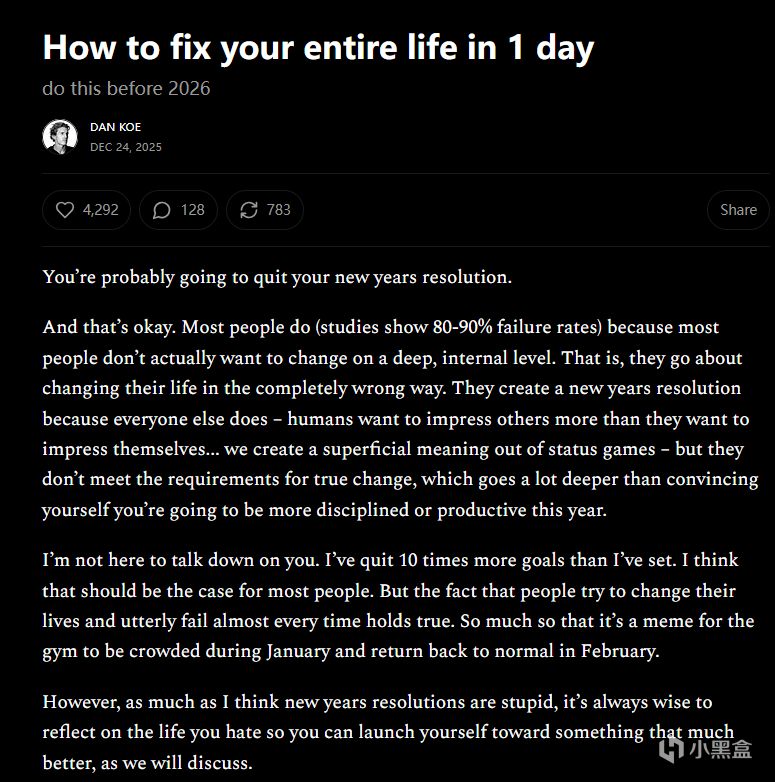 最近刷到 Dan Koe 那篇全網爆火的《How to fix your entire life in 1 day》,兩億閱讀量可不是吹的!