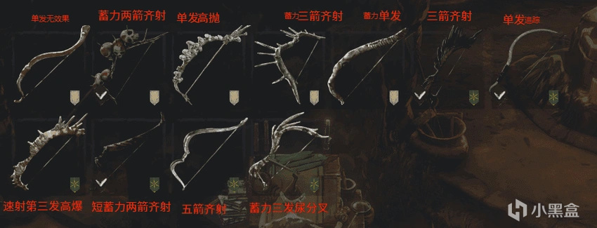 4、其他武器选择:游戏前期是不会解锁这把武器,可以使用其他弓替代,所有弓箭的普攻模组见下图(游戏中还有一把金装漆木弓放在后边讲解)