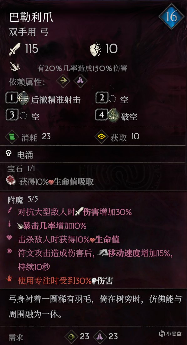 2、金色武器的词缀不能够替换,但如果要完美发挥武器的词缀,会增加操作量,在紧张的战斗中容易失误,所以我们直接“化繁为简,天下武功为快不破”,直接用巴勒利爪走“普攻流”,但如果游戏前期就有这把武器,就当它是个白板武器,建议还是无脑使用,