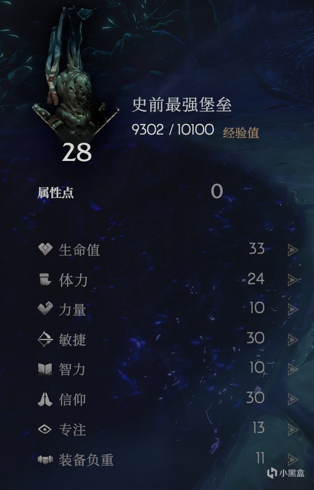 装备负重:加点到11,只要不是超重就可以,状态是重型(可以在人物界面的右下角查看负重,负重旁边的数值是人物韧性值)