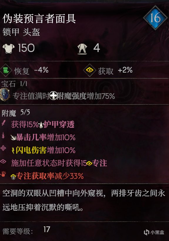 负面词缀不唯一:但不要选择“在战斗中消耗专注”和“受到伤害时减少专注”,因为我们需要保持满蓝状态,发挥每件衣服上的宝石增益(注:头盔的宝石增益只会作用头盔上的五条词缀,其他装备同理)