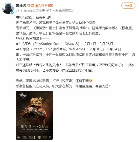 微博原文如下:“春歸馬蹄疾,新程有舊禮。丙午馬年將至,遊戲科學全體成員在此給大夥拜個早年。春節期間,《黑神話:悟空》準備了新春限時折扣,遊戲所有數字版本(標準版、豪華版、豪華升級包)即將在全平臺陸續開啓七五折優惠。”