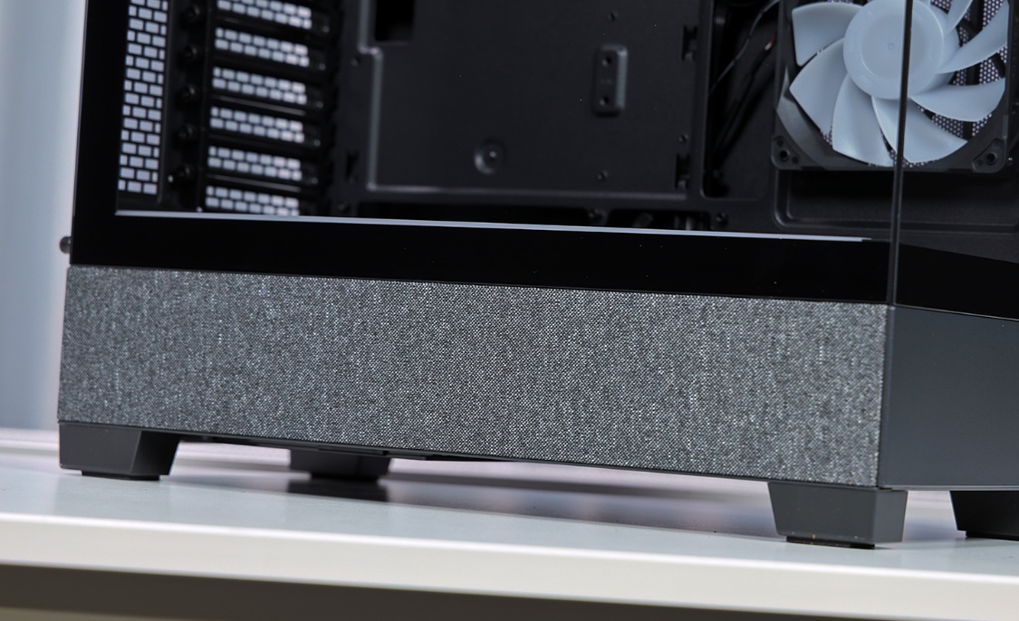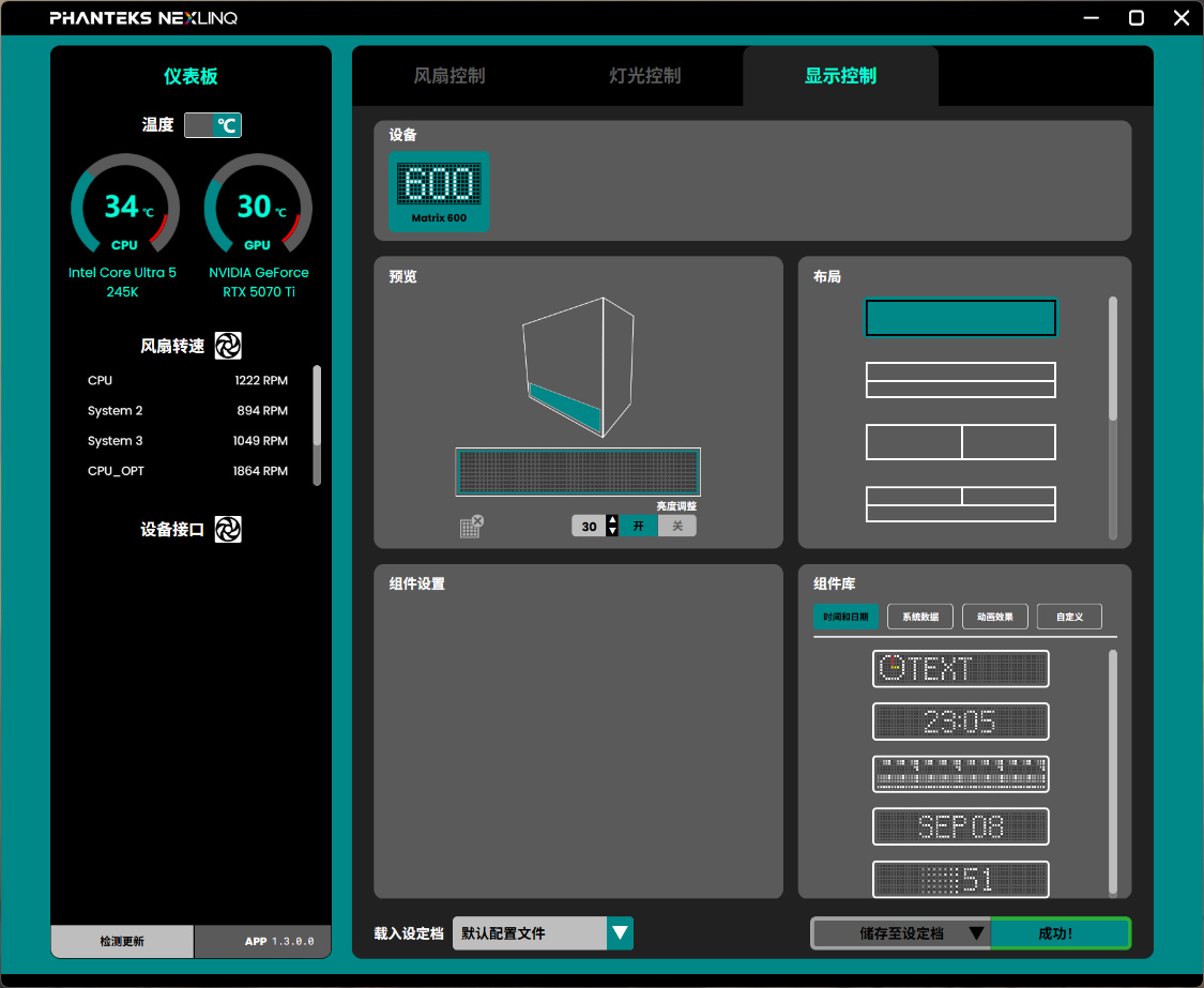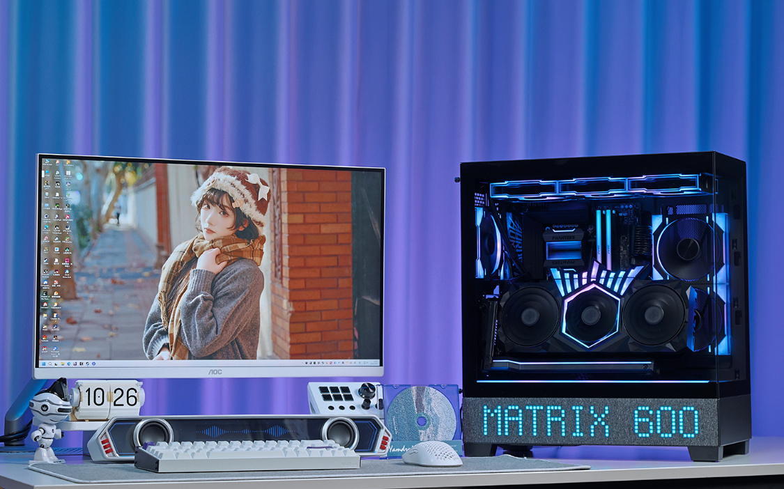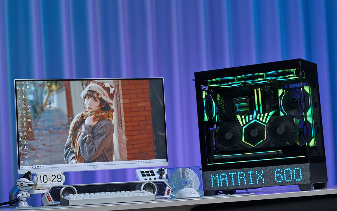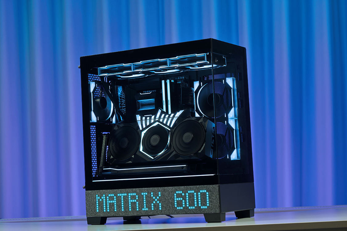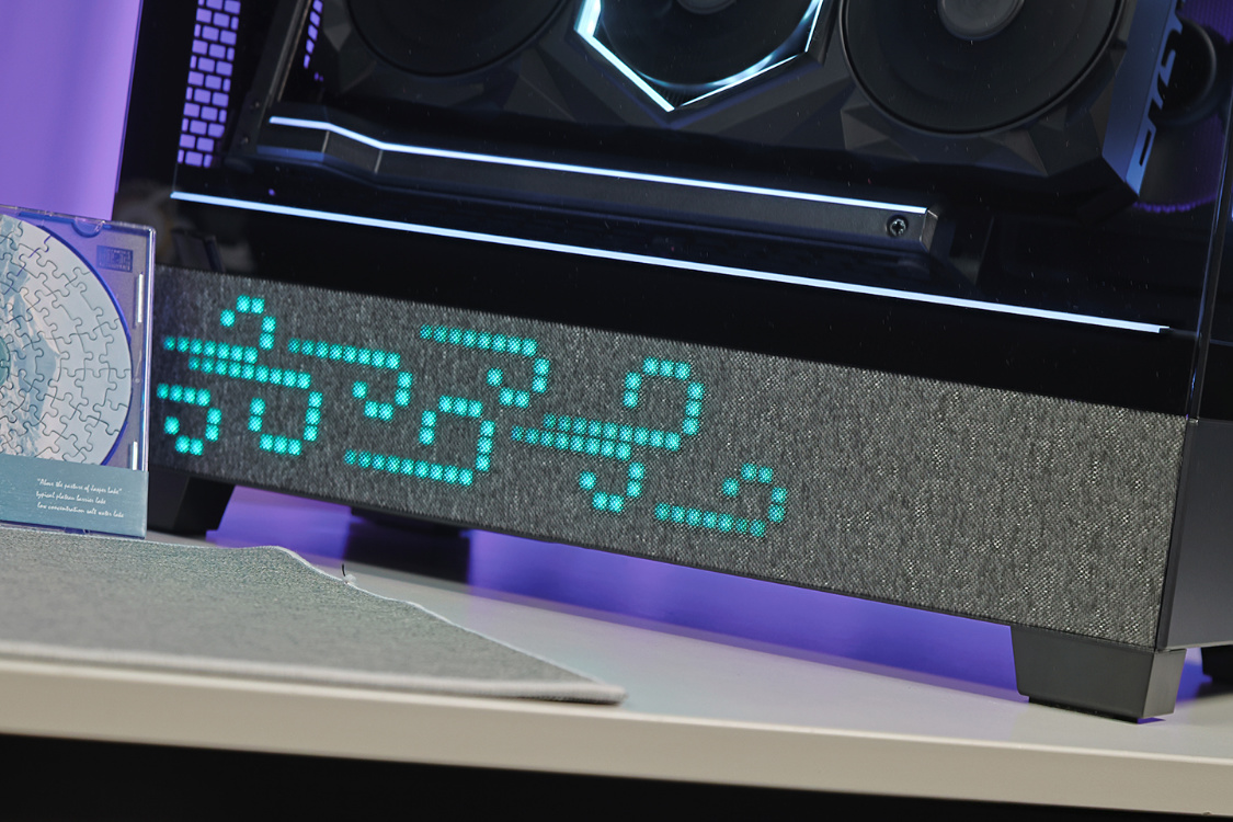 机箱用料扎实,主体框架采用了厚度达0.8mm的SPCC冷轧钢板和厚度达3mm的钢化玻璃,单机箱净重达7.65KG。机箱左侧玻璃面板的底部配备了一条ARGB灯带,而在左侧玻璃面板的下方还集成了一块表面覆盖了布艺蒙皮的追风者 Matrix 600像素点阵显示屏模块,模块三围:437*77*20mm,模块内置了600颗RGB LED像素点,并通过SATA供电和USB 2.0插针接口连接至主板,通过追风者配套的控制软件,可以在像素屏上显示出时间、电脑硬件实时状态、小动画以及玩家自定义的文字内容,可玩性拉满。