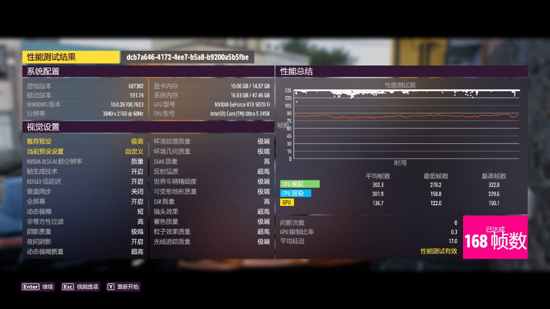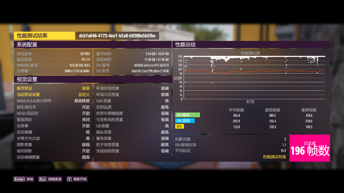 《极限竞速·地平线5》测试,4K分辨率下,极端画质,极端光追,开启DLSS 3.0并设为超高性能模式,游戏平均帧数196 FPS,DLSS为质量模式时,游戏平均帧数168 FPS;