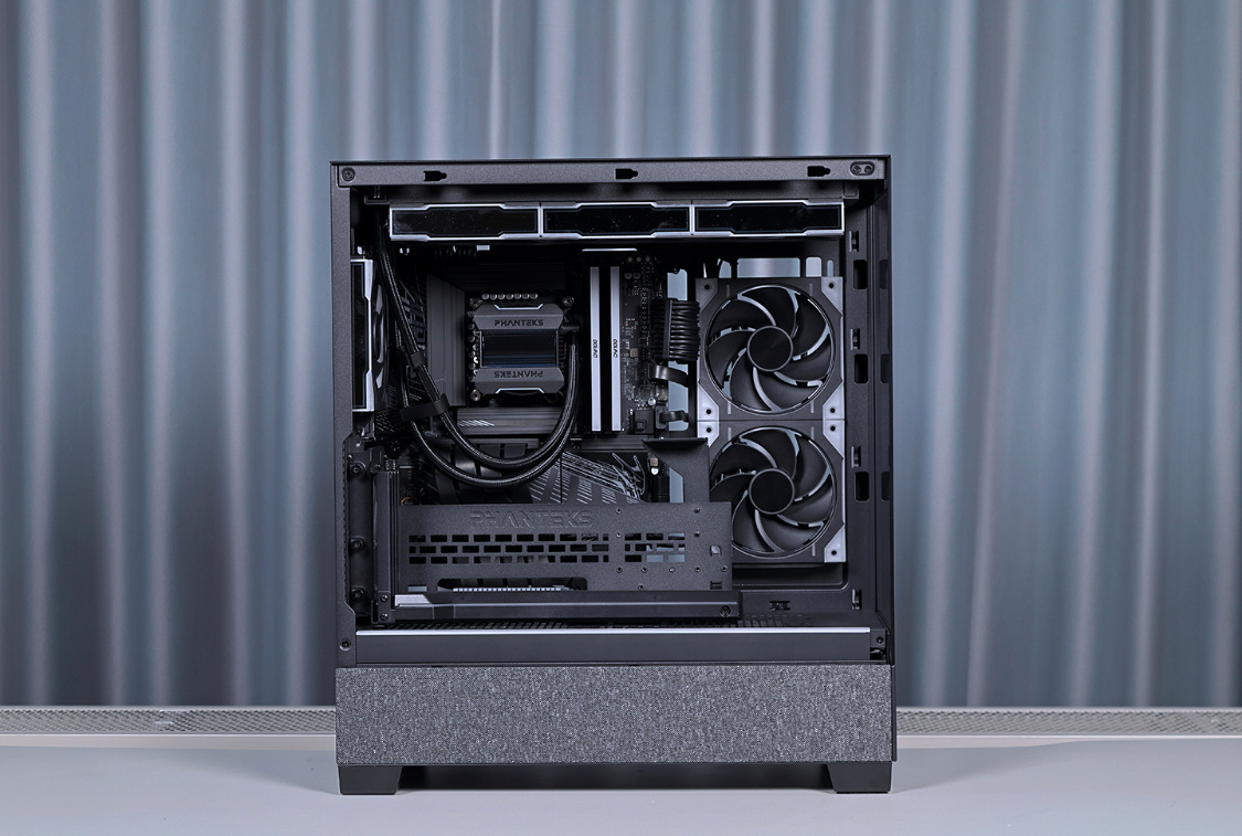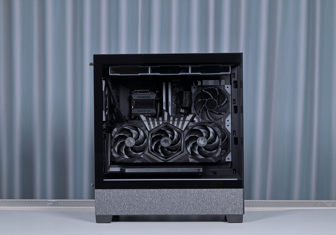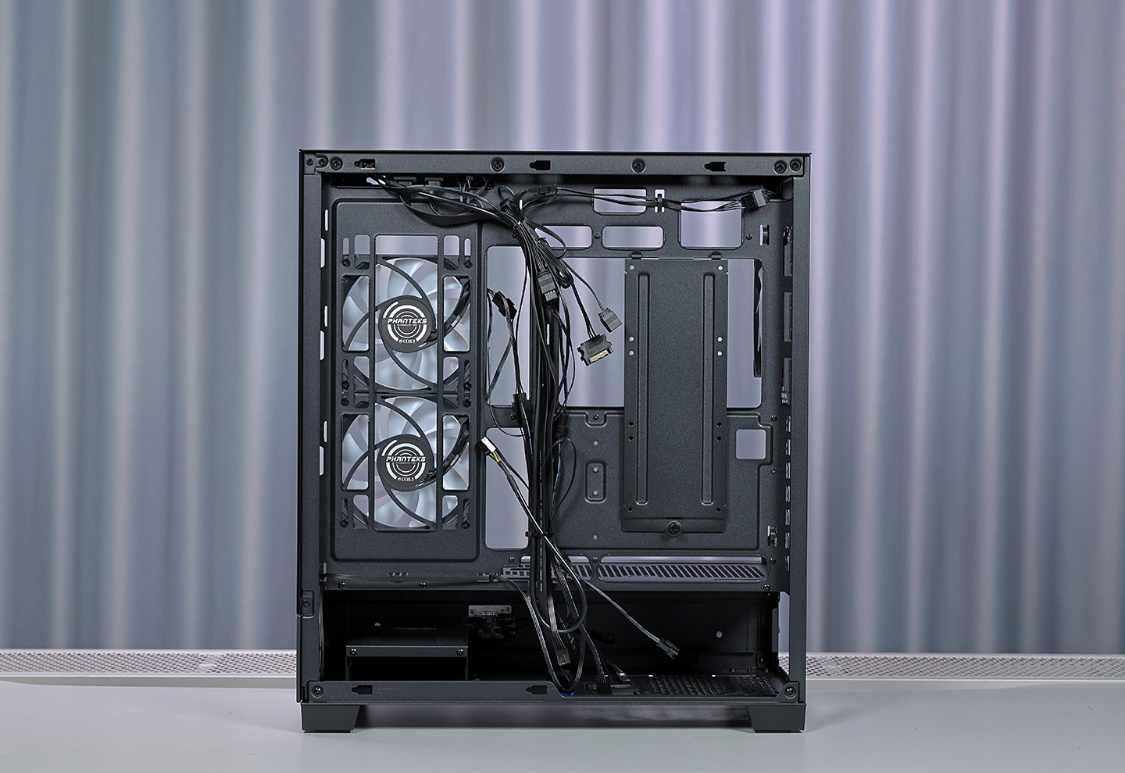 机箱采用双面可拆结构设计,两块侧板均采用了手拧螺丝+卡榫的结构固定。取下两块侧板,机箱内部空间宽敞,最大支持安装尺寸不超过305*280mm的E-ATX规格主板,显卡安装限长415mm。支持顶置安装360规格水冷,也支持安装高度不超过184mm的风冷,最大可安装9把120mm风扇。