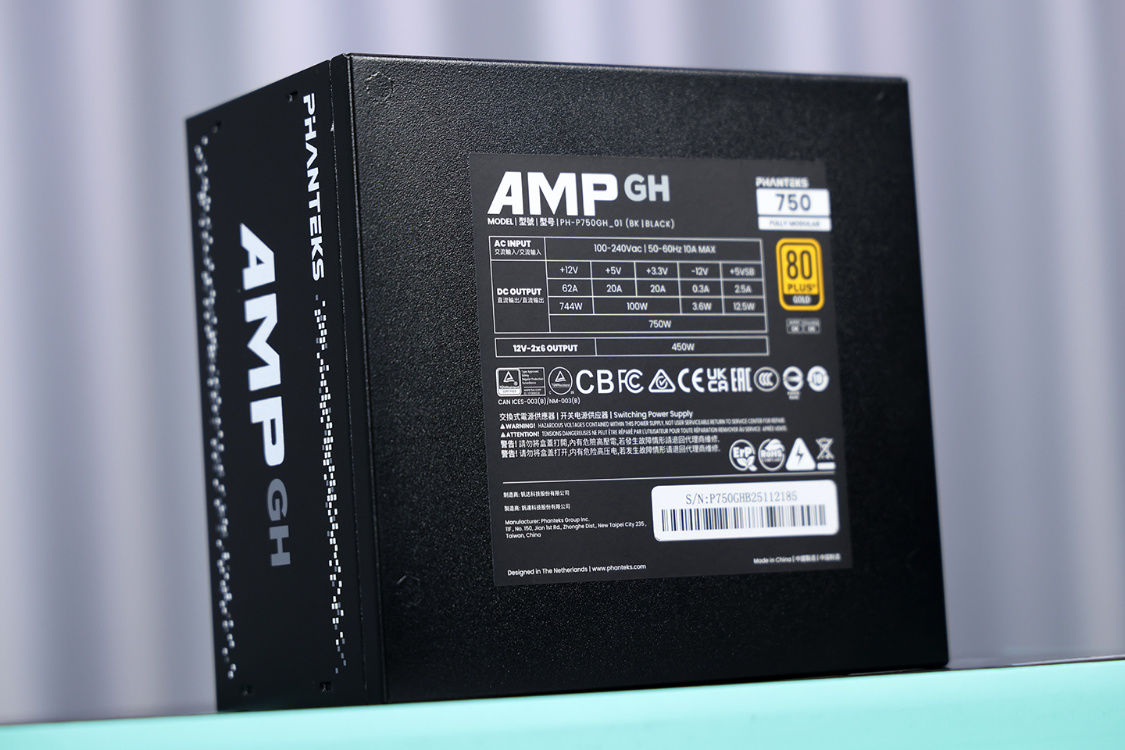 电源支持100-240v宽幅电压,总功率为750W,其中,+12v直流输出电流为62A,直流输出功率744W,+5V与+3.3V直流输出电流均为20A,联合直流输出功率为100W;+5V待机输出为2.5A,直流输出为12.5W。12V-2x6接口最大输出功率为450W。同时,电源提供了过流、过压、欠压、抗浪涌等多重保护机制,并支持8年超长质保。